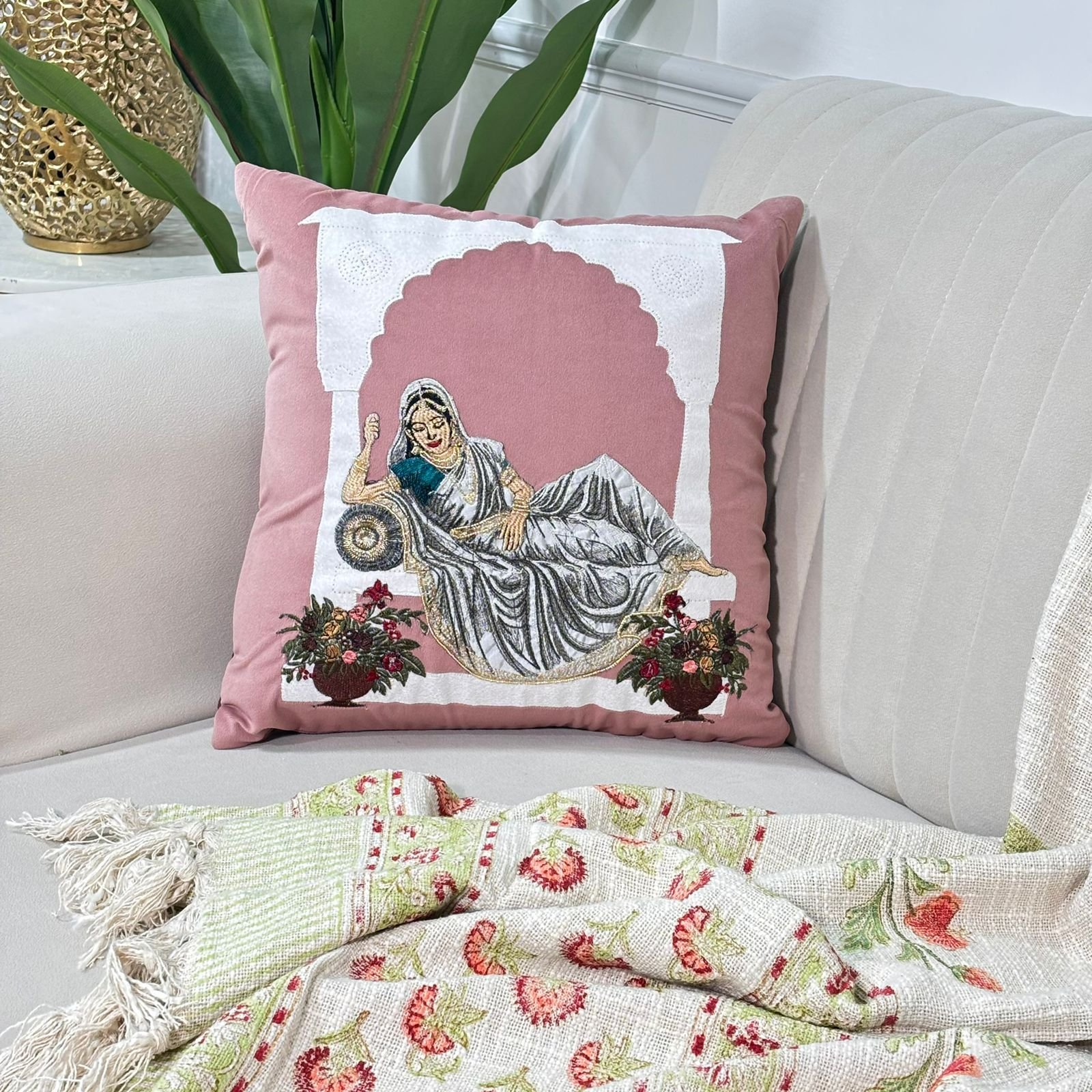 This elegant cushion cover features a graceful heritage-inspired artwork, beautifully embroidered on a soothing dusky rose (pink-brown) base. The detailed motif, framed with a soft ivory arch, adds a timeless and artistic charm to your living space.