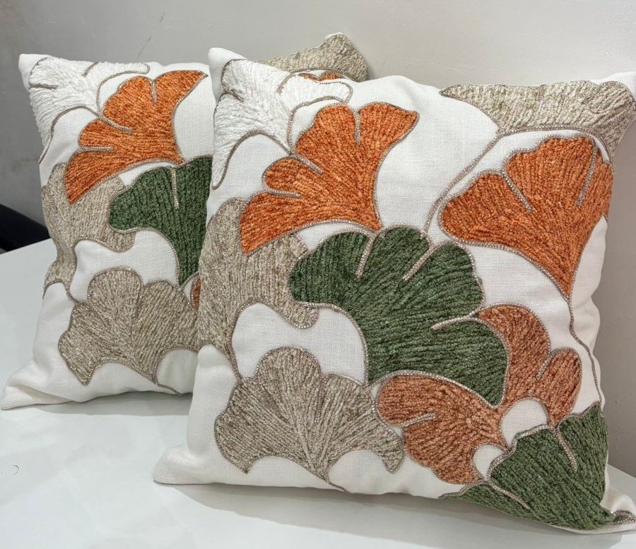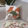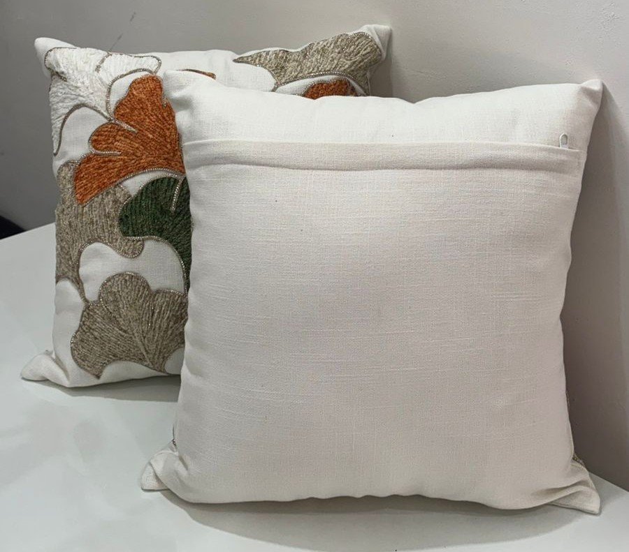 This cushion cover features a rich leaf-inspired design with raised embroidery that adds depth and character. Crafted on a sturdy cotton–linen blend fabric, it offers a natural feel with lasting durability. The soothing off-white base is beautifully highlighted with rust orange, olive green, and beige tones, creating a warm, earthy look perfect for living rooms or bedrooms. Soft to touch, breathable, and easy to maintain, it blends comfort with artistic elegance.