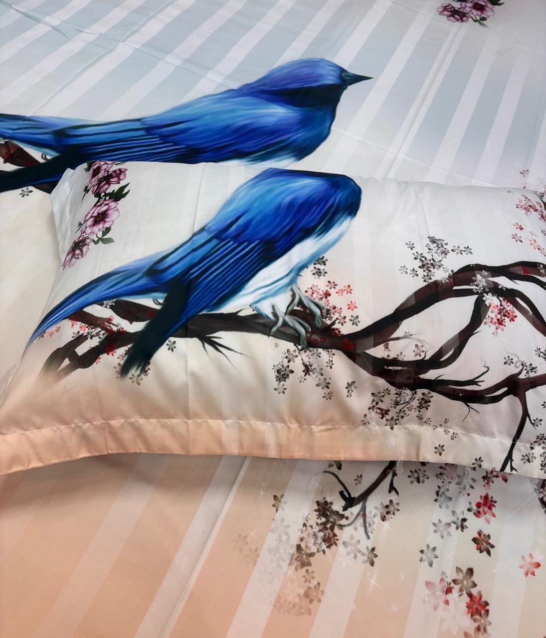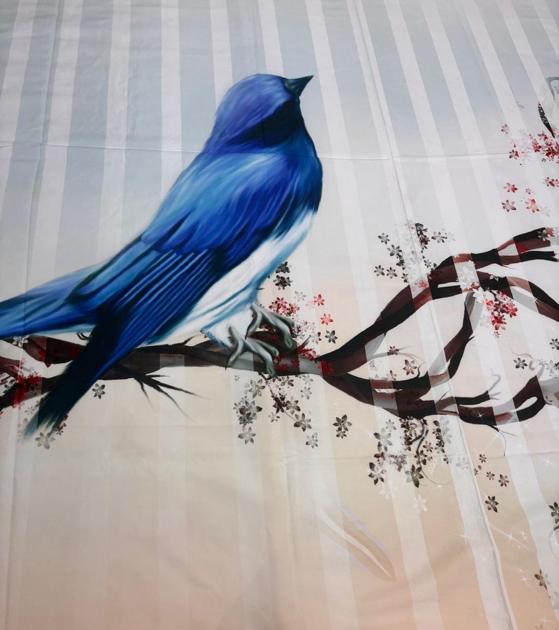Infuse your bedroom with the tranquil beauty of a morning garden with our Azure Bluebird Ombré Bedsheet. This artistic set features a masterful horizontal gradient and delicate wildlife illustration, creating a serene and uplifting atmosphere for your sleep sanctuary.