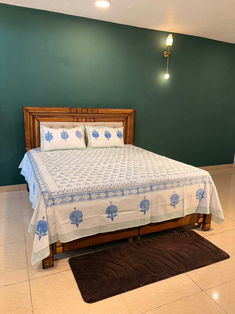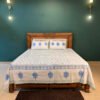 Serene and soothing, this Blue Lotus bedsheet features a refined hand block printed pattern with lotus motifs in calming blue tones on soft, breathable 100 percent cotton. A graceful blend of traditional artistry and everyday comfort for your king-size bed.