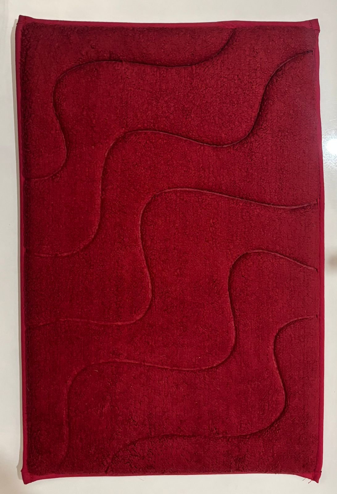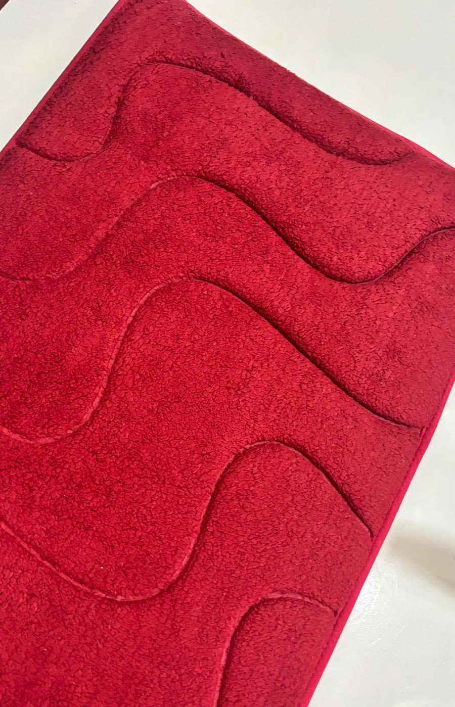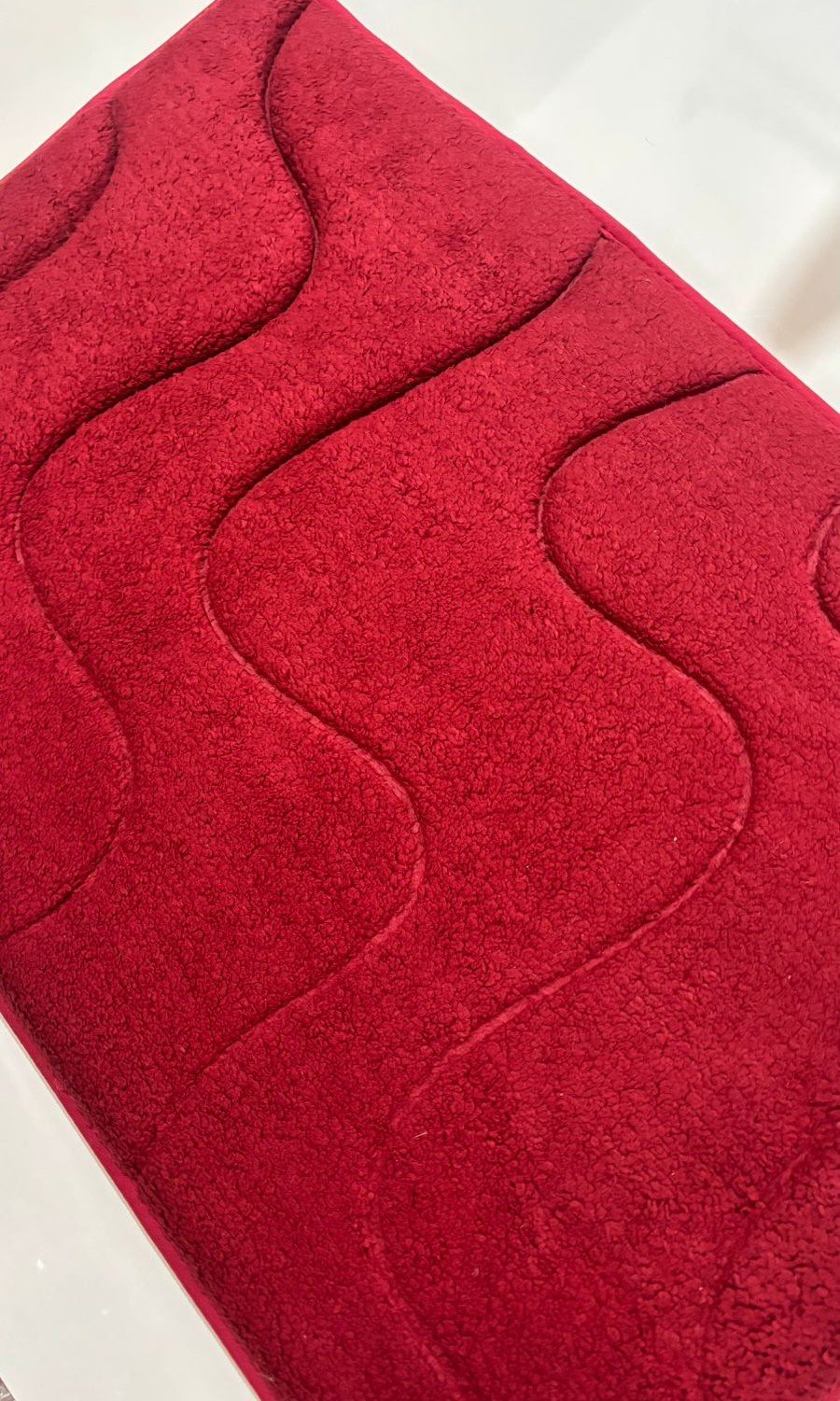This elegant floor mat features a rich red tone with a smooth wave-inspired embossed design that adds depth and style to any space. Made with soft, plush fabric, it feels gentle underfoot while providing everyday comfort. The thick pile helps absorb moisture and dust, making it ideal for bedrooms, living areas, or near entrances.