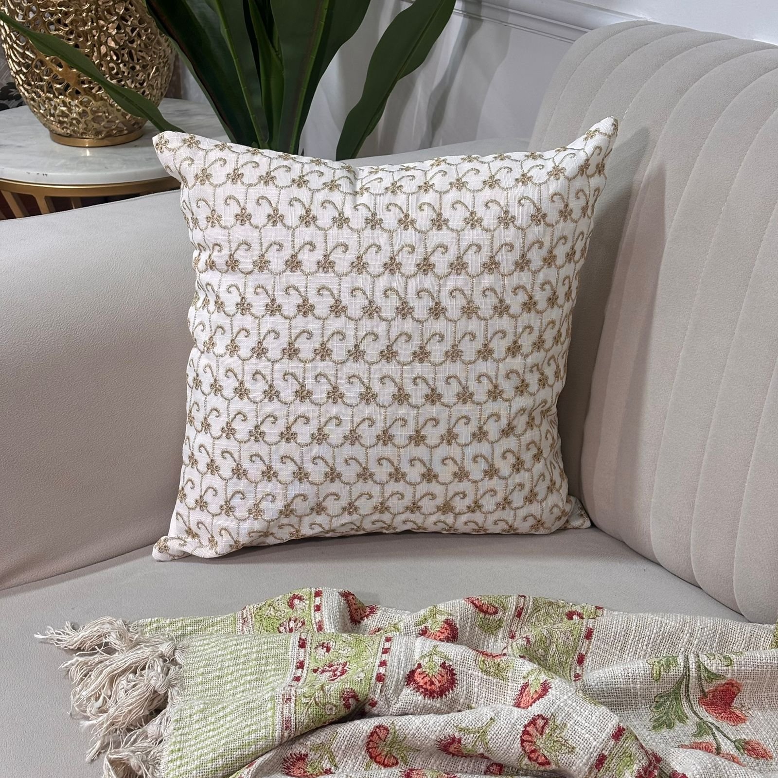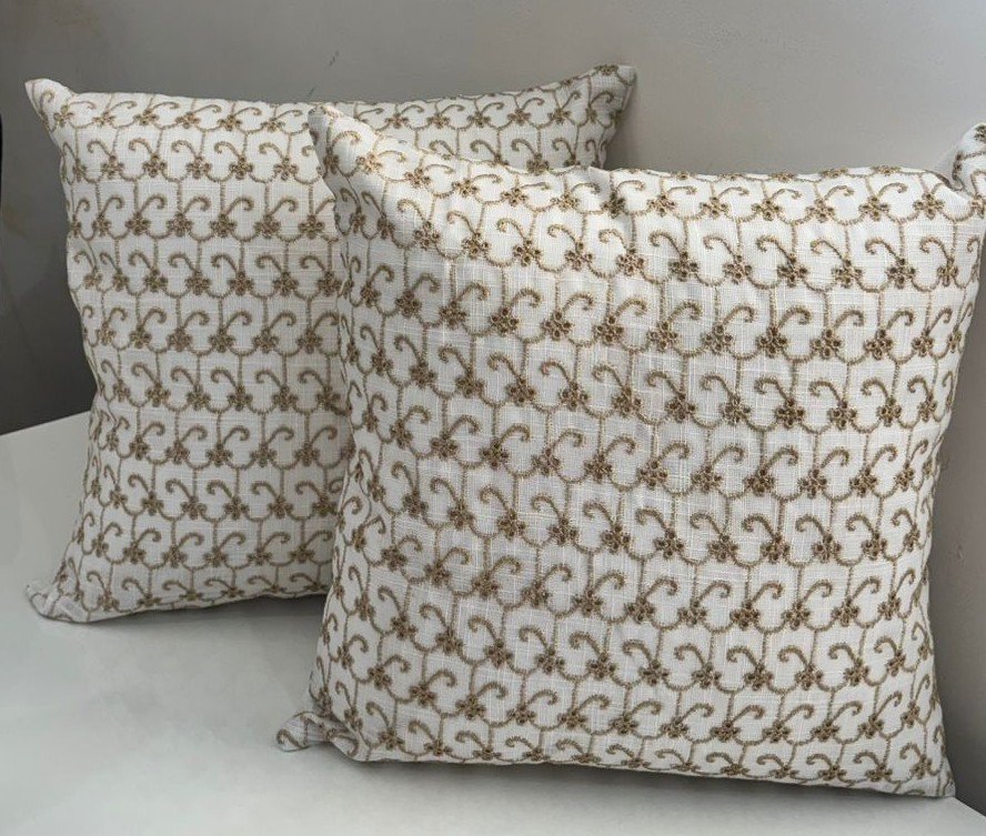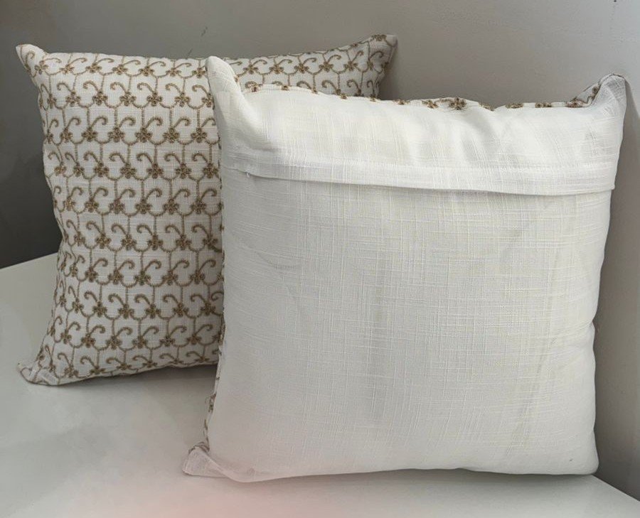 Enhance your interiors with this elegant cushion cover featuring a timeless trellis embroidery pattern in soft gold tones on an ivory base. The repeating motif adds a refined, symmetrical look that blends beautifully with modern, classic, and luxury décor styles. Crafted from a sturdy, textured base fabric, the dense embroidery creates a rich surface while maintaining durability and shape. Ideal for sofas, beds, and accent seating, this cushion cover brings understated sophistication to any space.