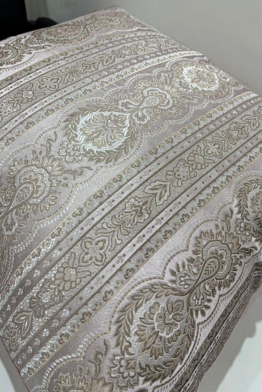 Bring understated elegance to your living space with this beautifully crafted cushion cover featuring intricate ornate patterns arranged in graceful horizontal bands. The detailed jacquard weaving showcases traditional motifs with a refined, symmetrical layout, creating a rich yet balanced look. Soft neutral tones with a gentle sheen add warmth and sophistication without overpowering the décor.
