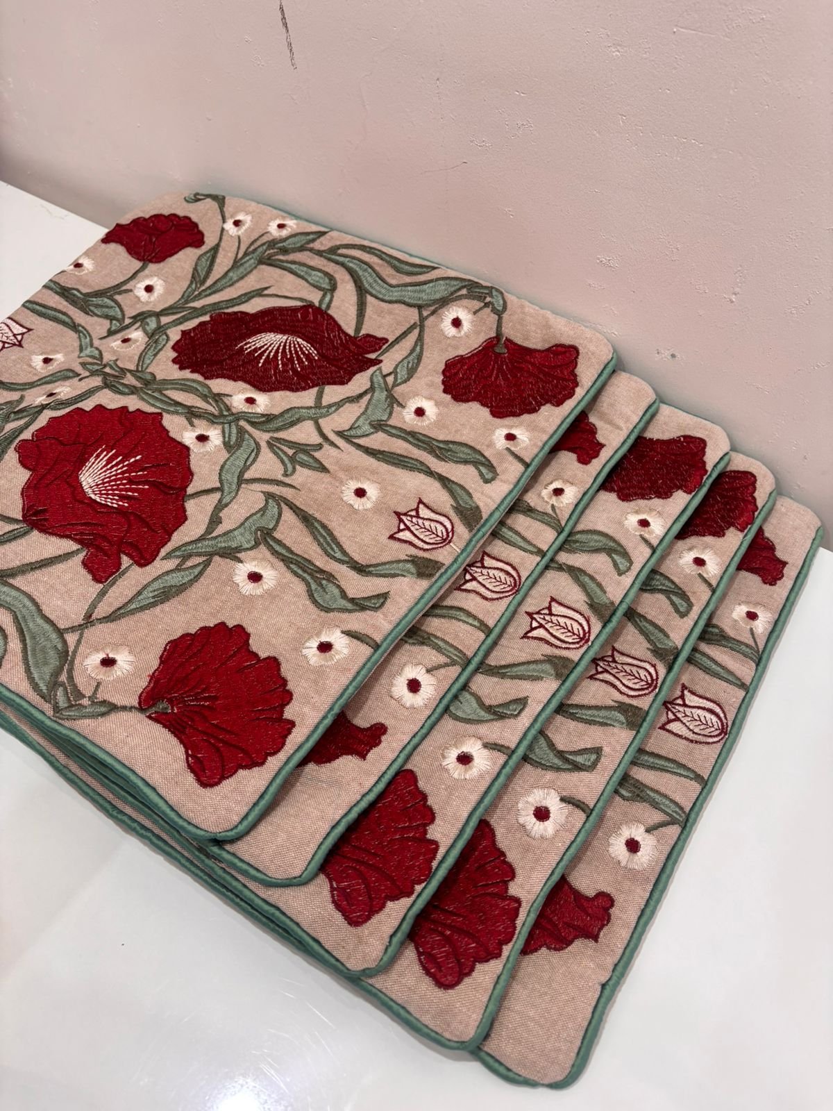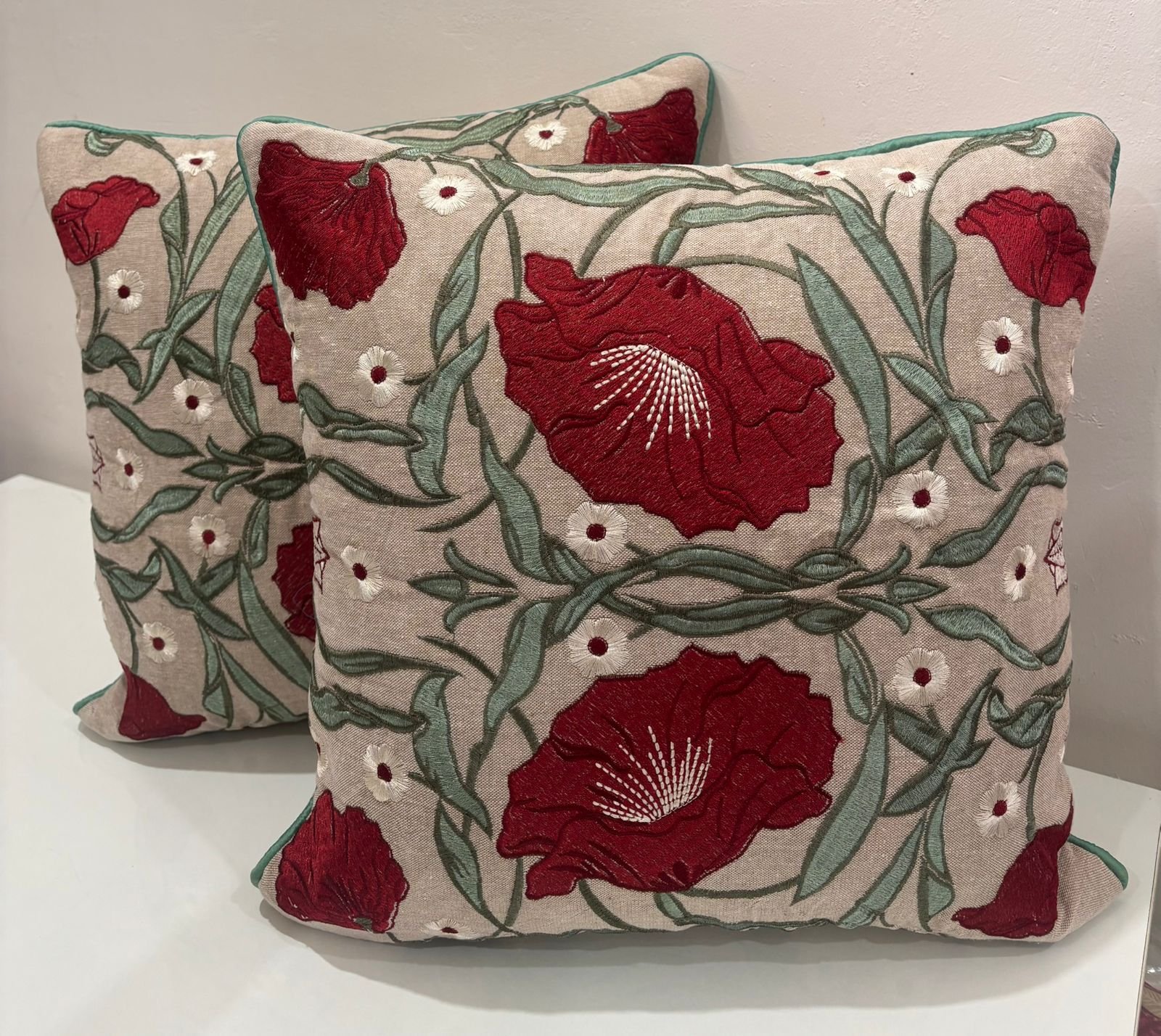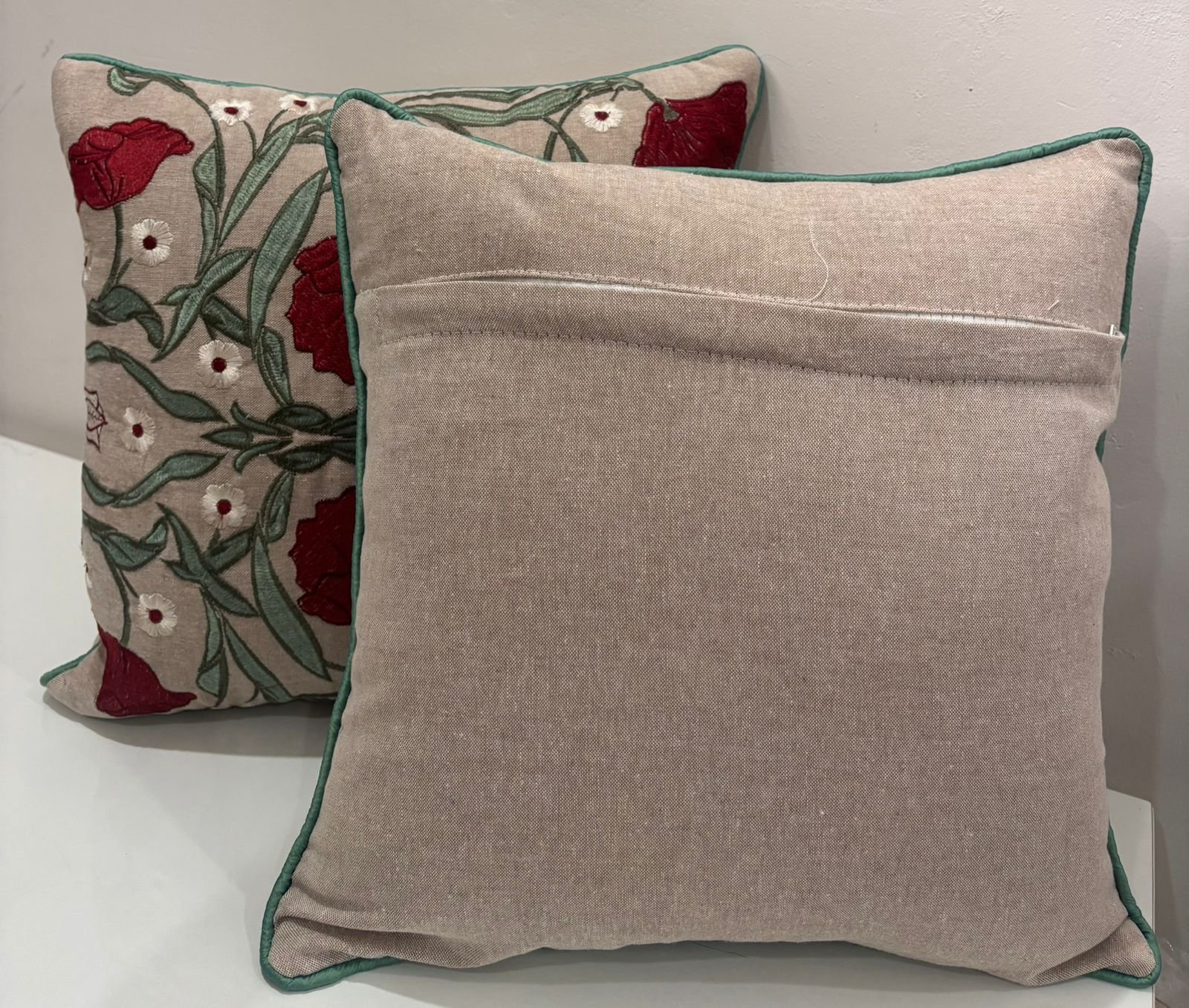 Make a bold yet elegant statement with this richly embroidered cushion cover. Featuring deep crimson floral motifs intertwined with soft green vines, the design feels artistic and timeless. Set against a warm neutral base, the detailed embroidery adds texture, depth, and handcrafted charm.