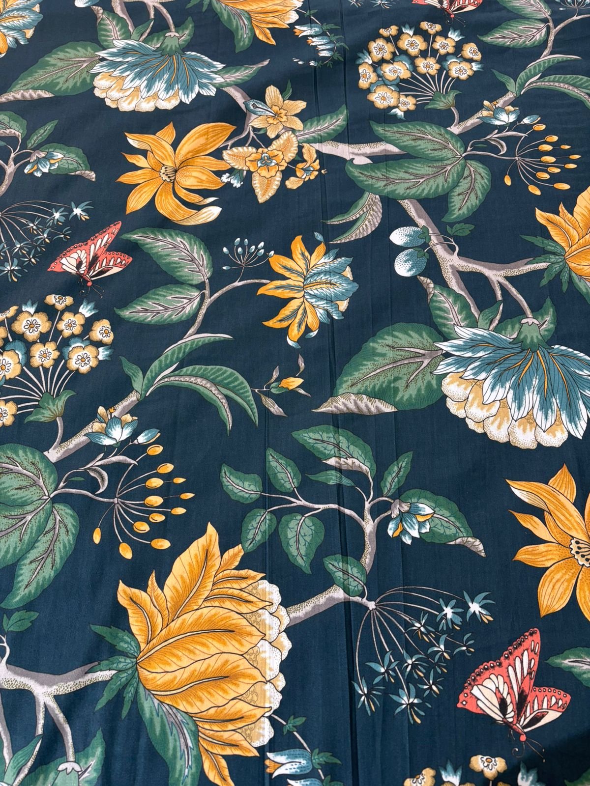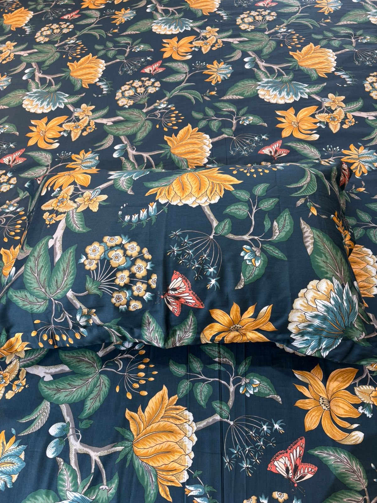 Elevate your bedroom décor with this rich dark green floral bedsheet set, beautifully highlighted with mustard yellow and soft leafy tones. The elegant botanical print creates a refreshing yet luxurious look, perfect for modern and classic interiors alike.