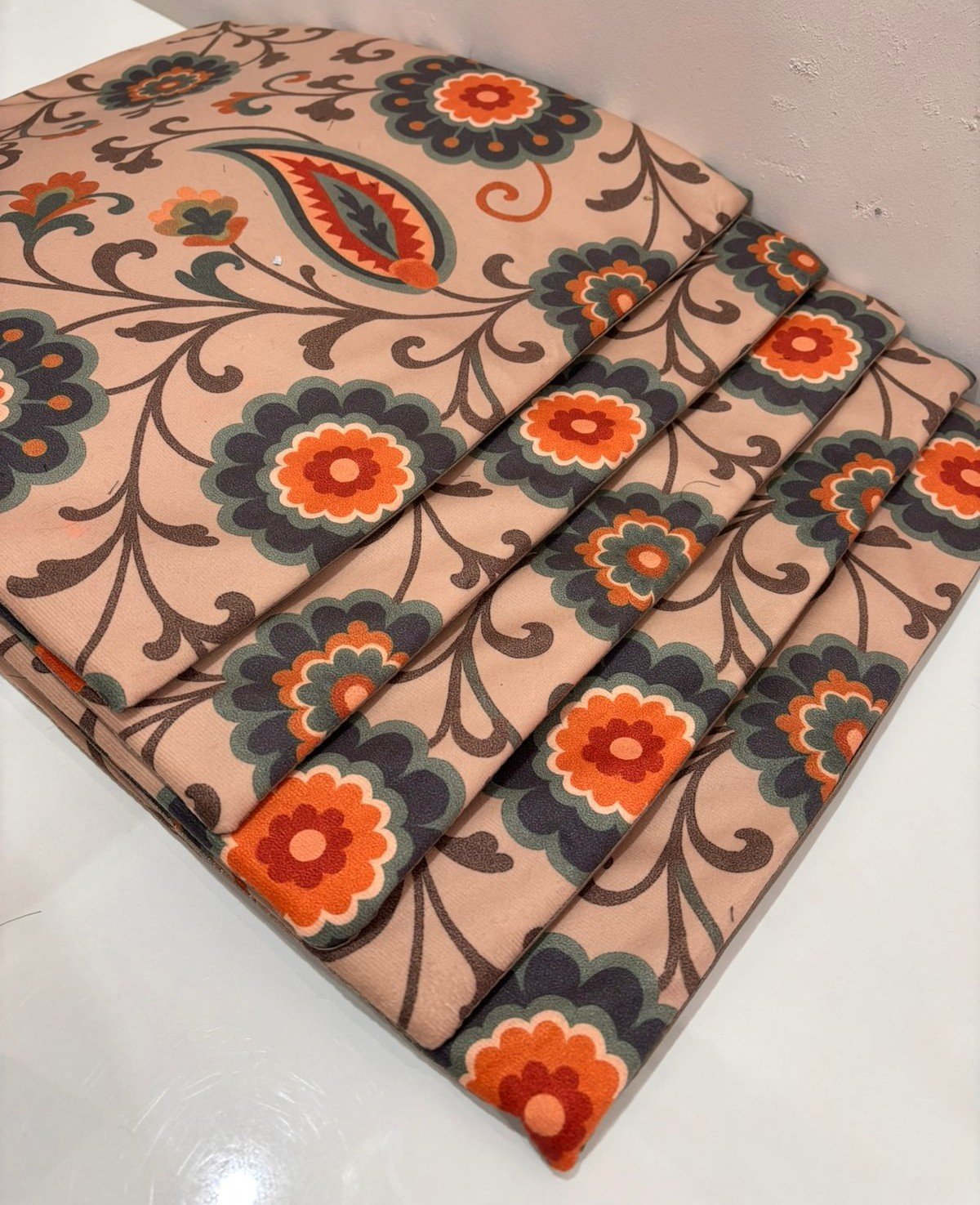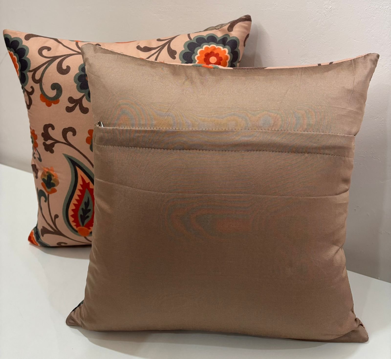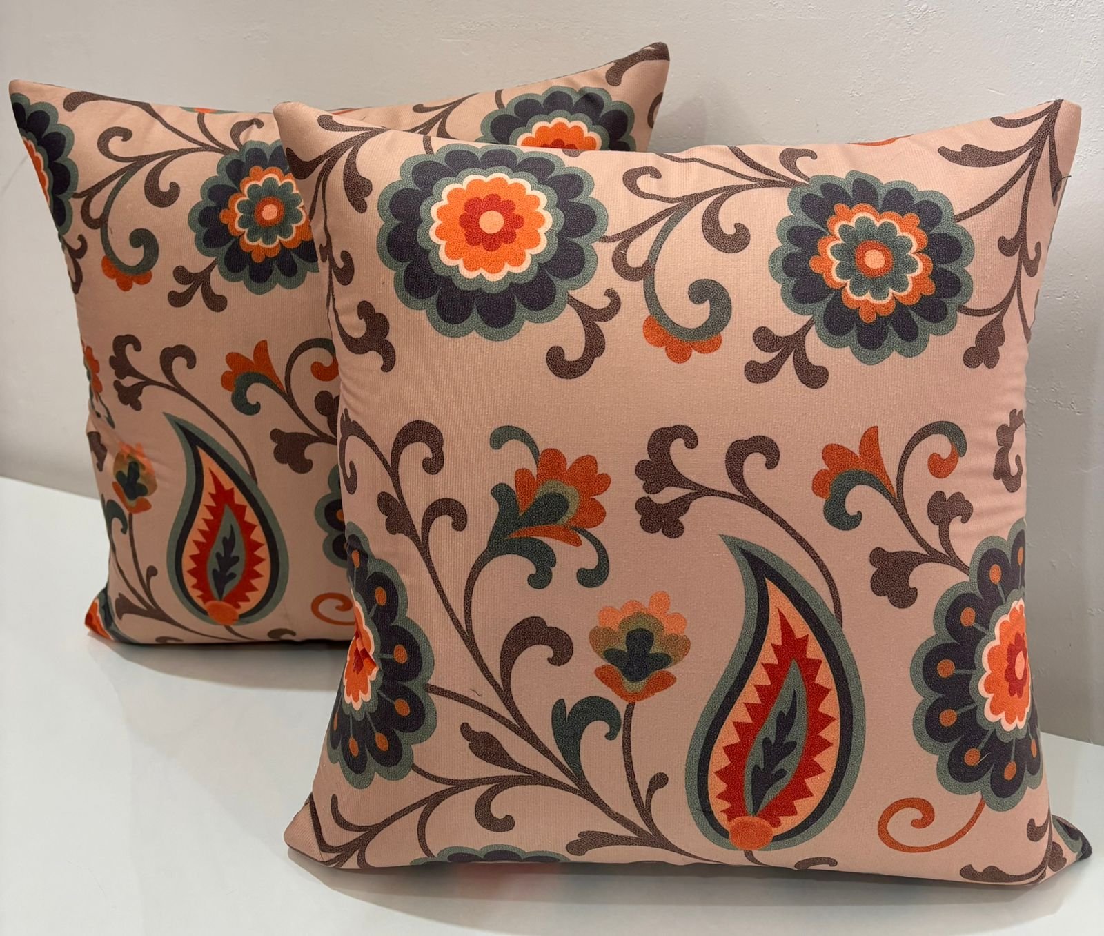Add warmth and charm to your living space with this beautifully designed cushion cover featuring a classic floral and paisley pattern. The soft peach base is enhanced with rich accents of orange, deep green, and brown, creating a harmonious and eye-catching look.