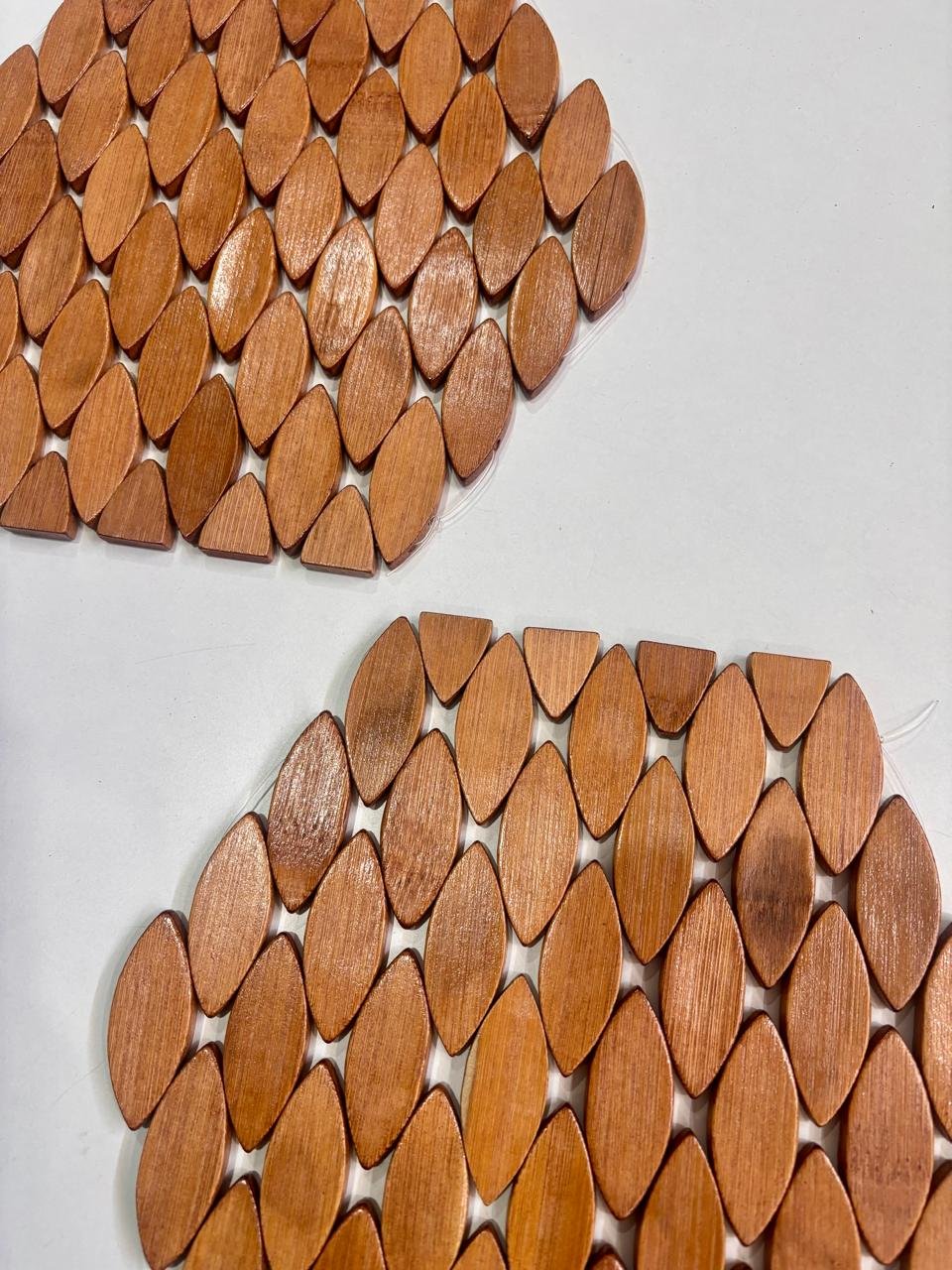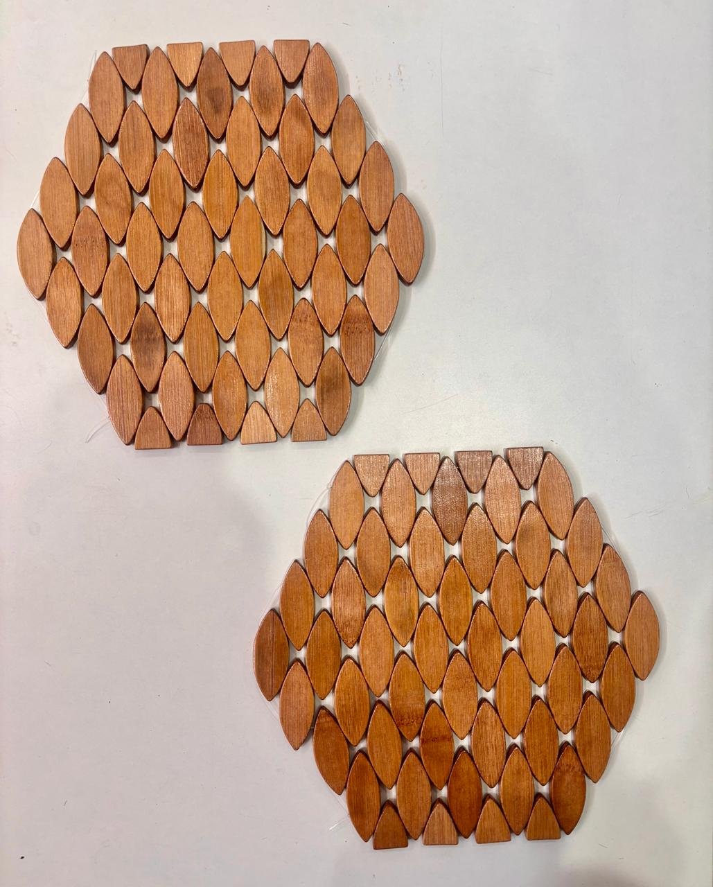 Enhance your dining table with this beautifully crafted hexagon wooden table mat featuring a stylish layered leaf pattern. Designed with smooth, polished wooden pieces arranged in a honeycomb-style hexagon shape, this mat adds a modern yet natural touch to your table setting.