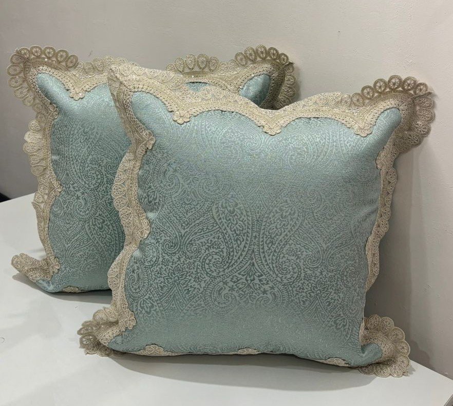 Add a soft, elegant charm to your décor with this beautifully designed cushion cover. Featuring a pastel aqua base with a subtle woven paisley pattern, this cushion is finished with an exquisite cream lace border all around. The delicate lace detailing gives it a vintage, classic appeal while maintaining a calm and sophisticated look.