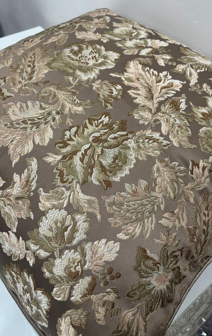 Enhance your home décor with this elegant taupe cushion cover, beautifully adorned with intricate gold floral woven patterns. The soft neutral base paired with rich metallic detailing creates a sophisticated and timeless look, ideal for living rooms, bedrooms, and formal seating spaces.