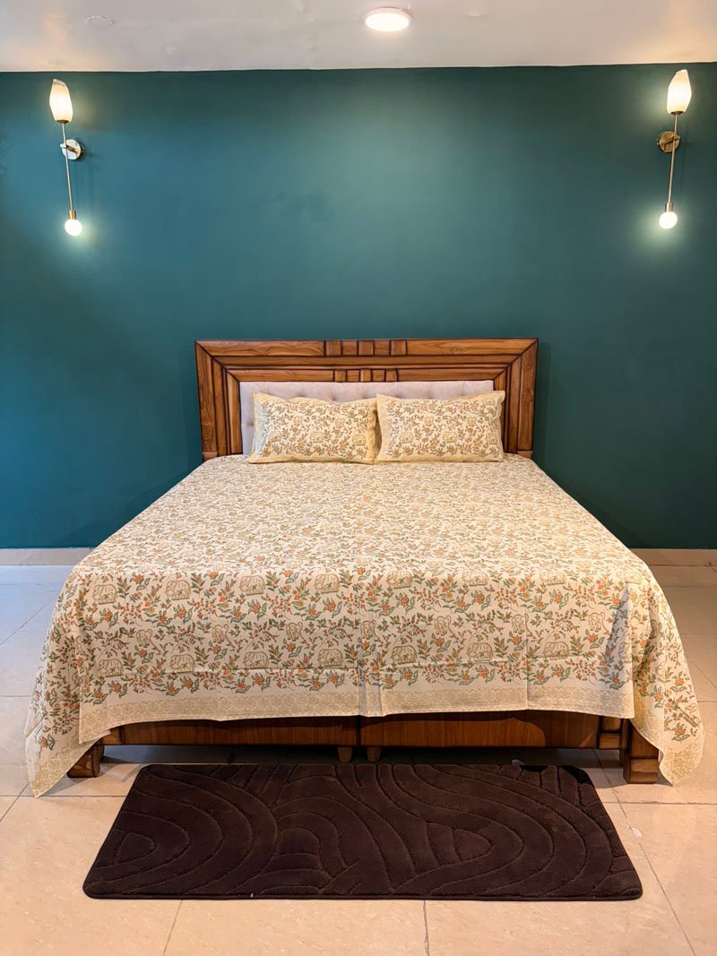 Elegant and earthy, this Elephant Garden bedsheet showcases a charming hand block printed design with floral motifs and traditional elephants on soft, breathable 100 percent cotton. A perfect fusion of comfort and heritage craftsmanship for your king-size bed.