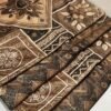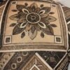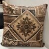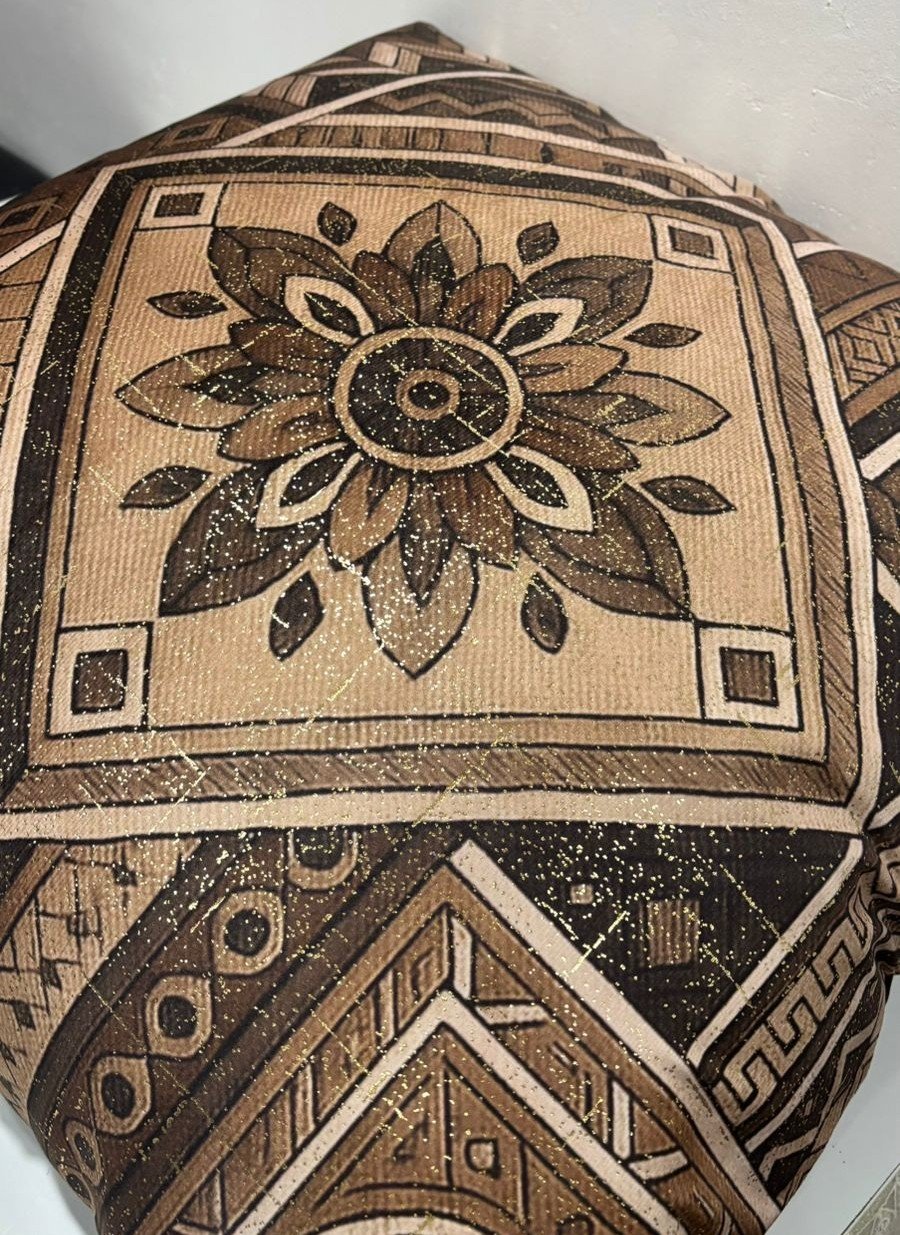 Bring an artistic and handcrafted feel to your space with this striking cushion cover featuring a bold geometric floral design. The central diamond-shaped motif is beautifully detailed with layered floral elements, surrounded by intricate ethnic and tribal-inspired patterns. Rich shades of brown, beige, and black blend harmoniously to create a warm, earthy palette that adds depth and character to your décor.