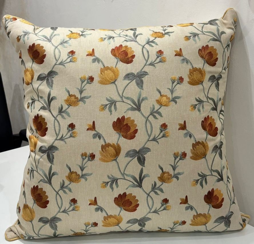 ring warmth and charm to your living space with this beautifully designed floral cushion cover. Set on a soft beige base, the delicate vine pattern features blooming flowers in rich mustard yellow, rust, and earthy brown tones, complemented by subtle grey-green leaves. The classic floral layout adds a timeless, handcrafted feel that suits both traditional and contemporary interiors.