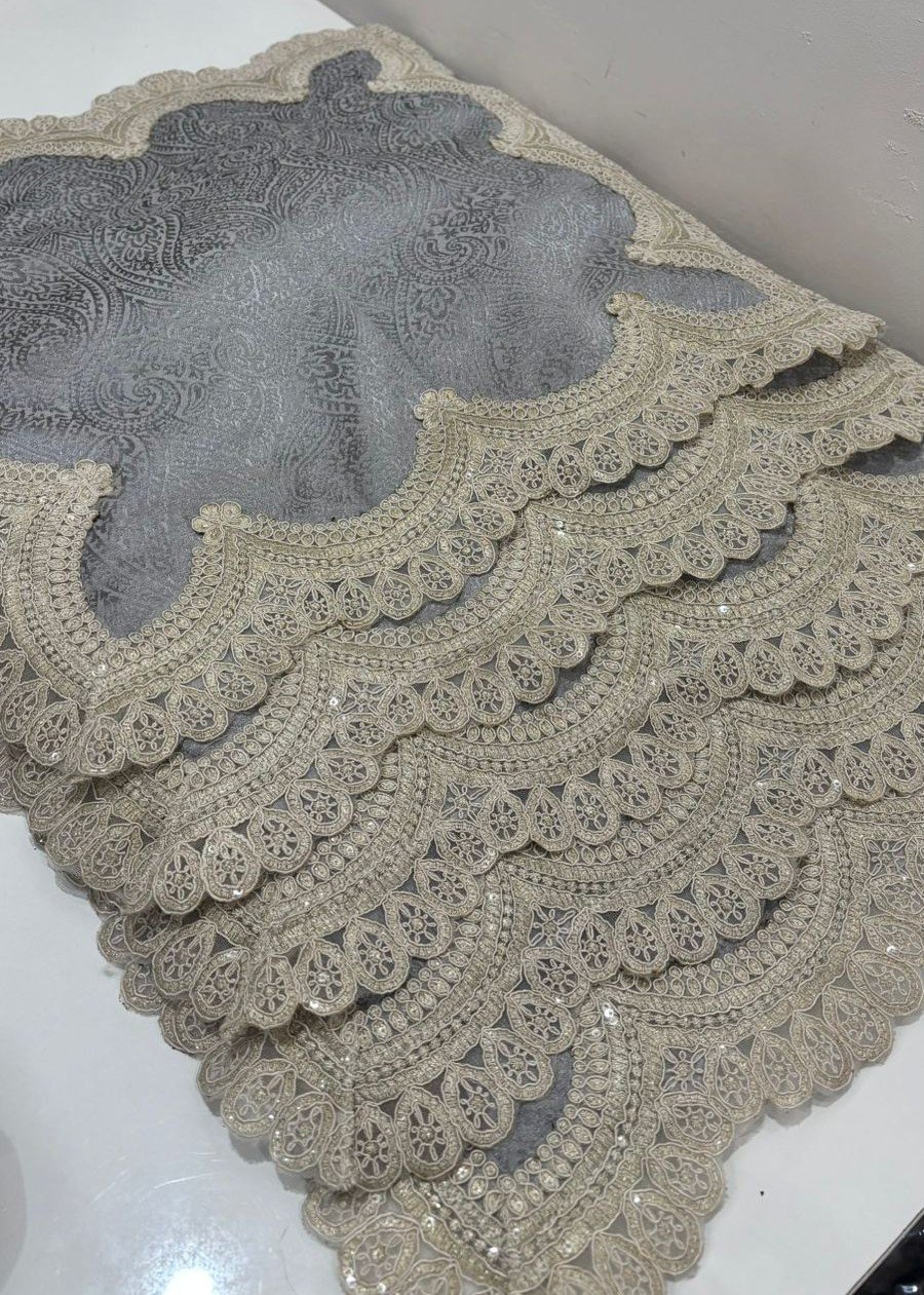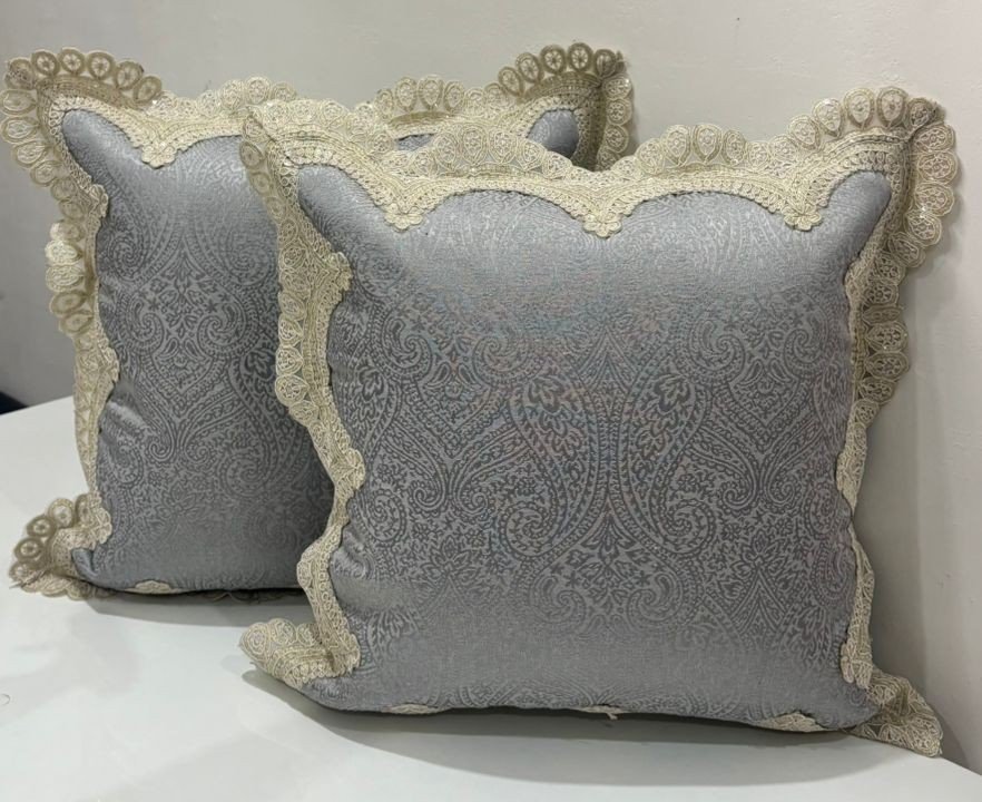 Elevate your living space with this elegant jacquard cushion cover, featuring a refined self-patterned surface framed by delicate lace edging. The soft grey tone paired with intricate woven motifs creates a timeless, graceful look that complements both classic and contemporary interiors. Carefully finished with ornate lace borders, this cushion cover adds charm, texture, and sophistication to sofas, beds, or accent chairs.
