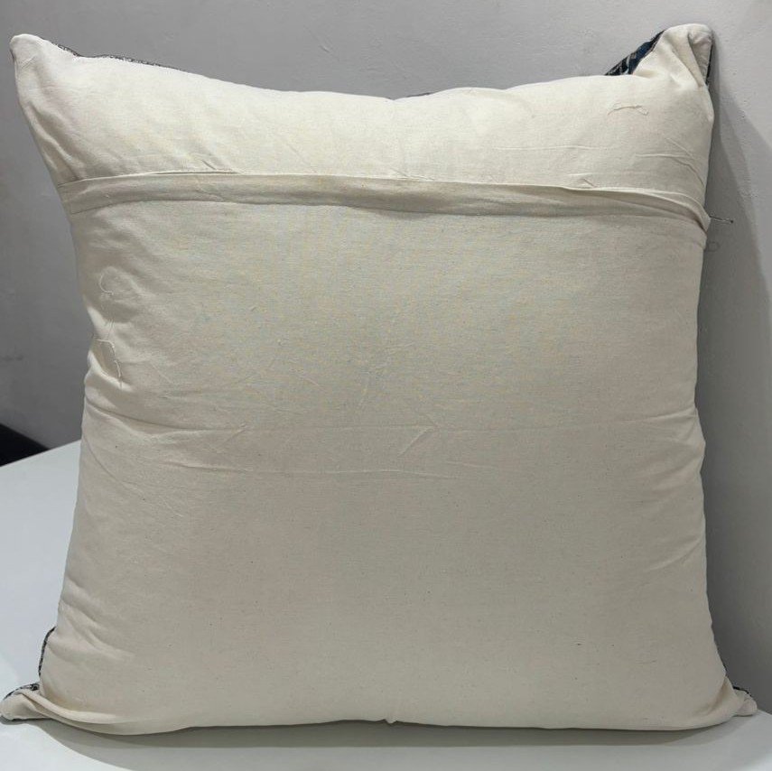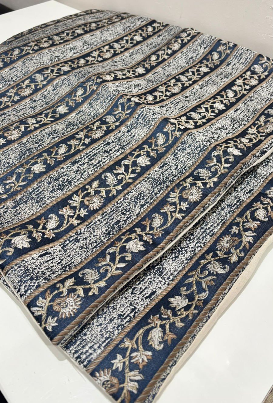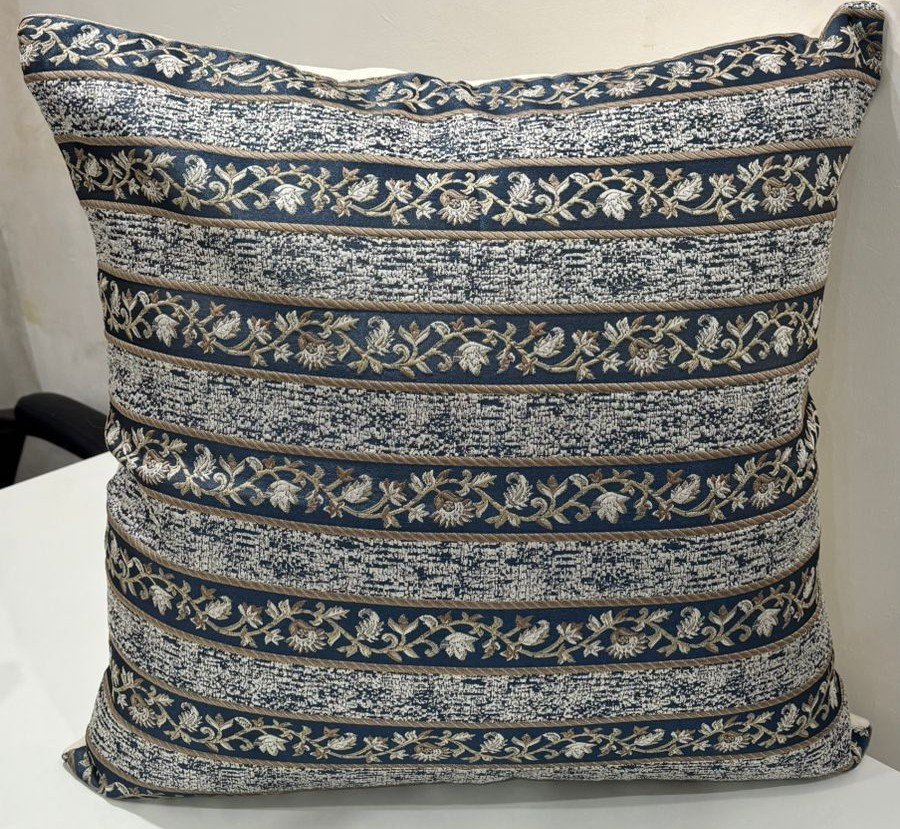 Bring timeless elegance to your living space with this refined cushion cover featuring deep indigo blue bands paired with ivory and beige textured stripes. Delicate floral embroidery running across the horizontal panels adds a handcrafted, regal touch, while the balanced colour palette keeps the look calm and sophisticated.