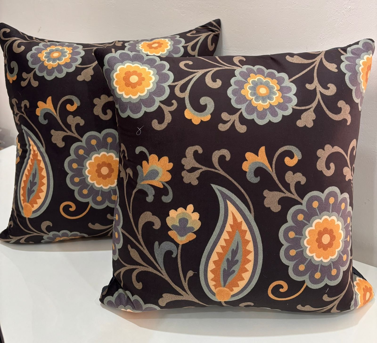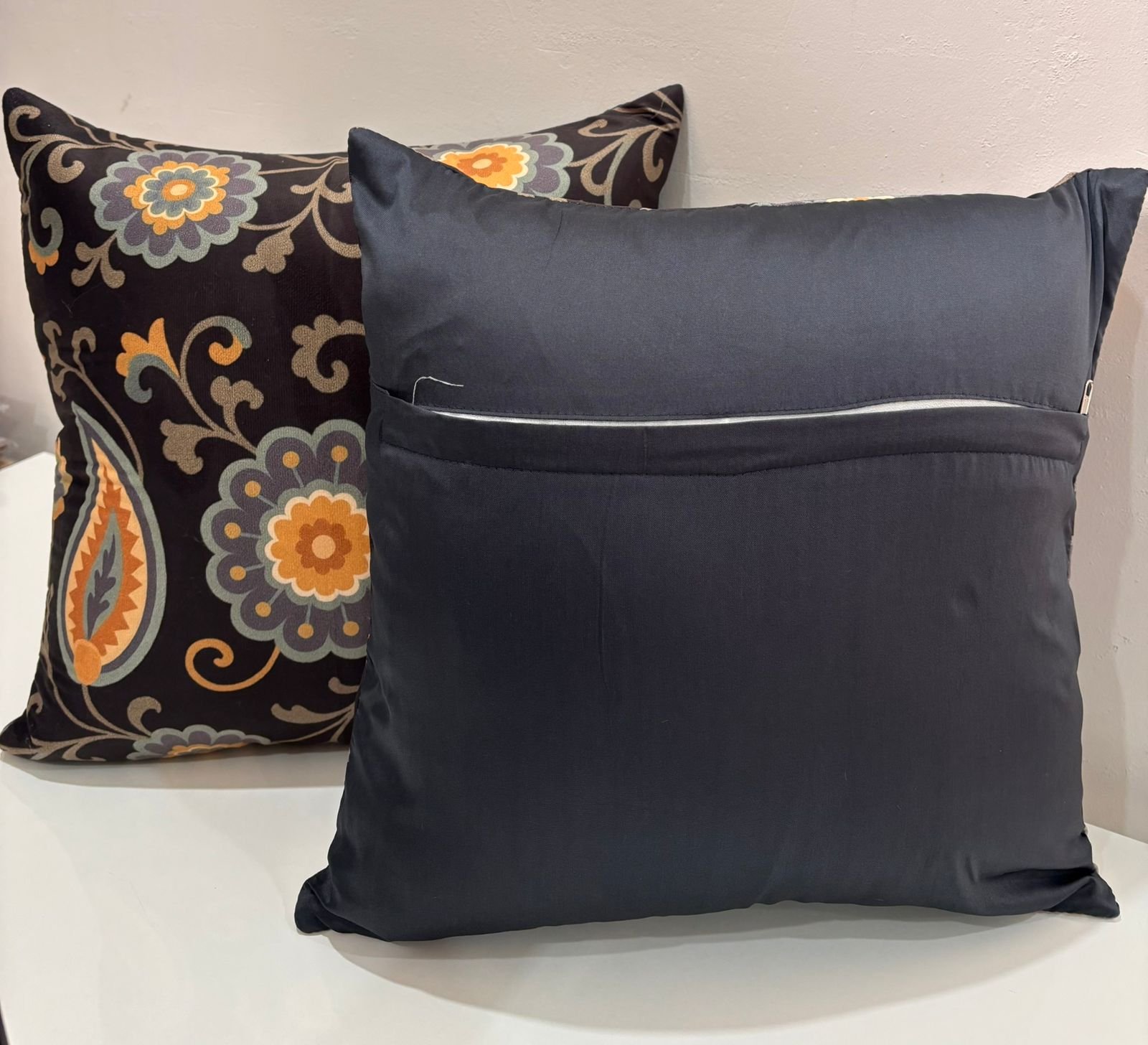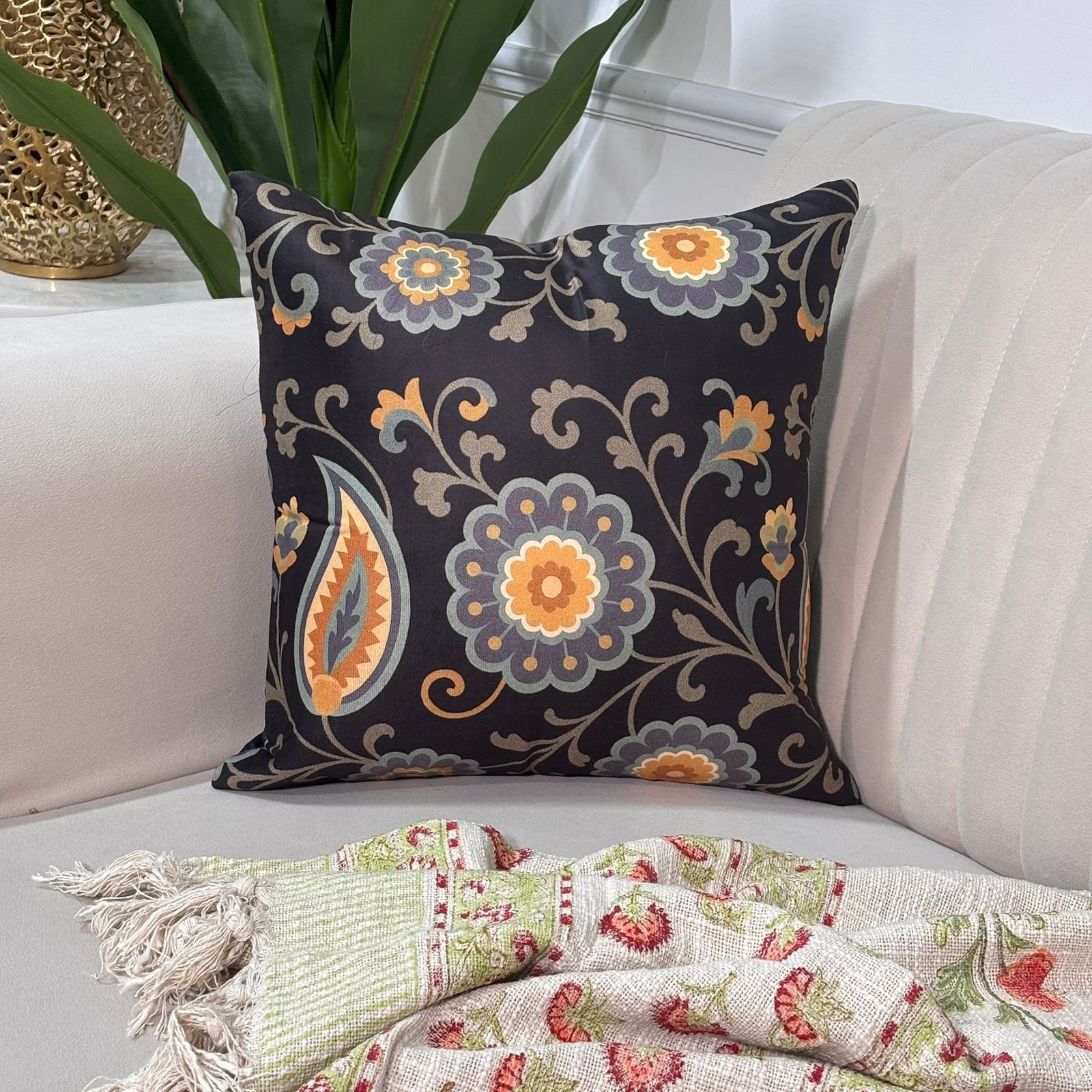 Create a bold and luxurious statement in your home with this striking cushion cover. Designed with intricate floral blooms and flowing vine patterns, it features a deep dark base highlighted by warm mustard, soft grey, and muted green accents.