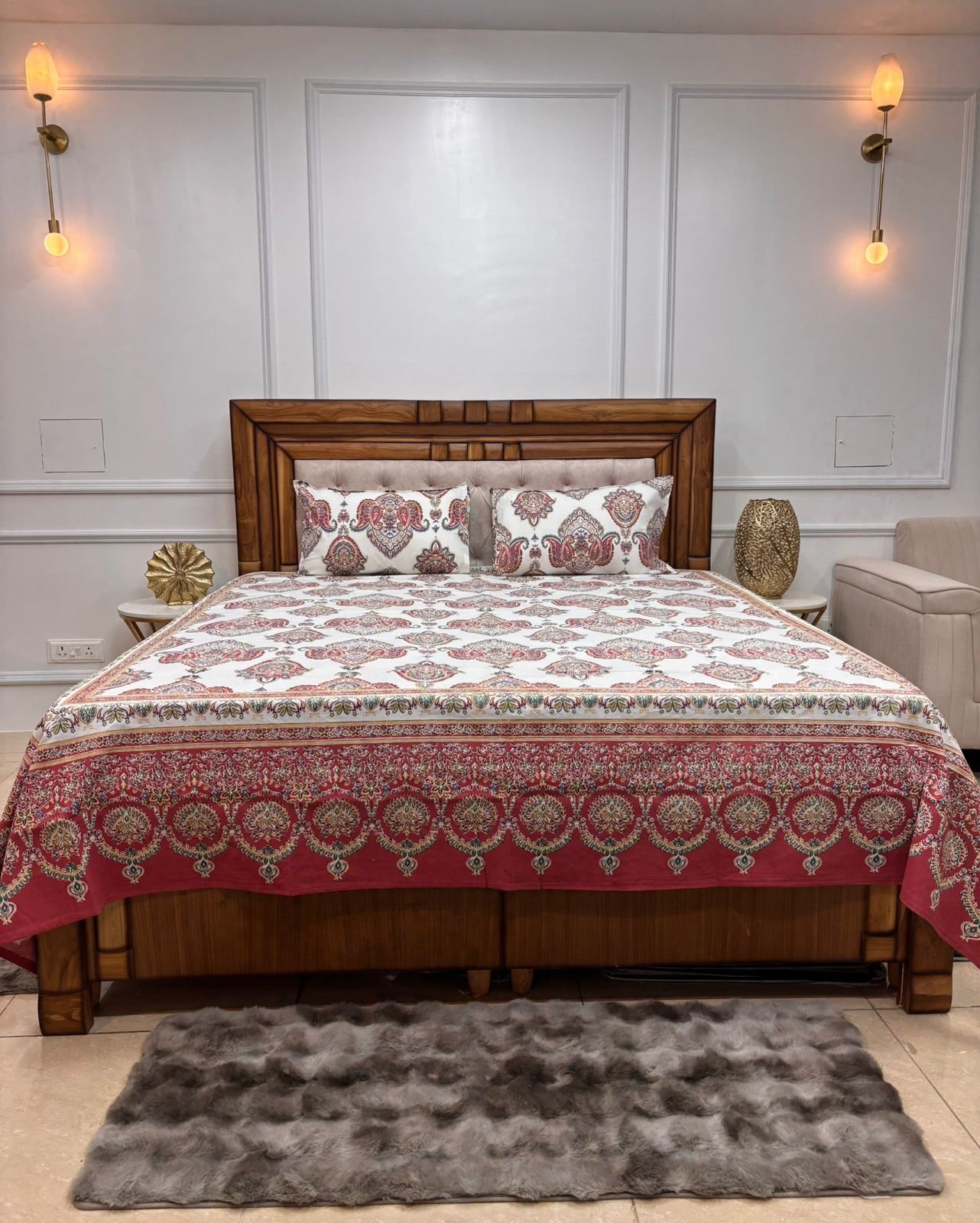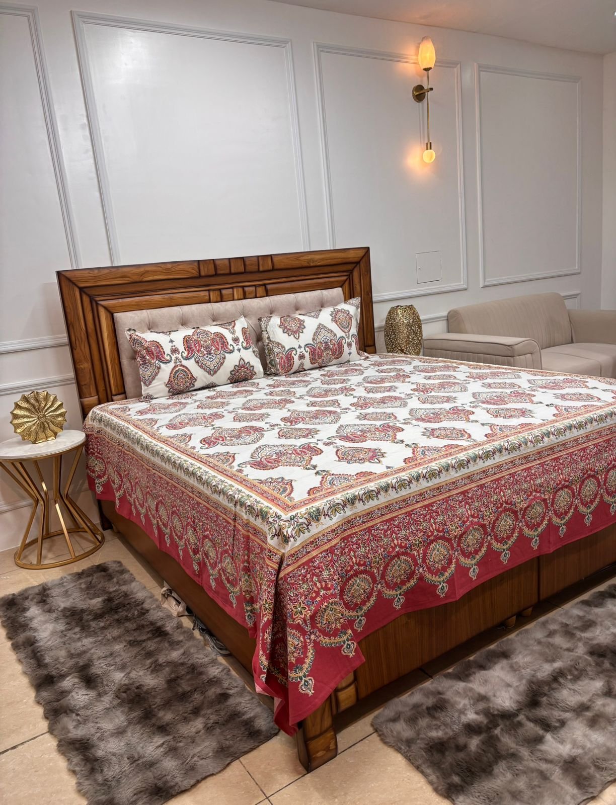 Bring timeless elegance to your bedroom with this 100% pure cotton bedsheet, crafted with intricate all-over motifs and a deep maroon traditional border that adds a royal touch. The naturally soft, breathable cotton fabric ensures all-night comfort and keeps you cool in every season. Designed for durability and everyday luxury, this bedsheet blends classic Indian artistry with modern comfort, making it perfect for both daily use and festive décor.
