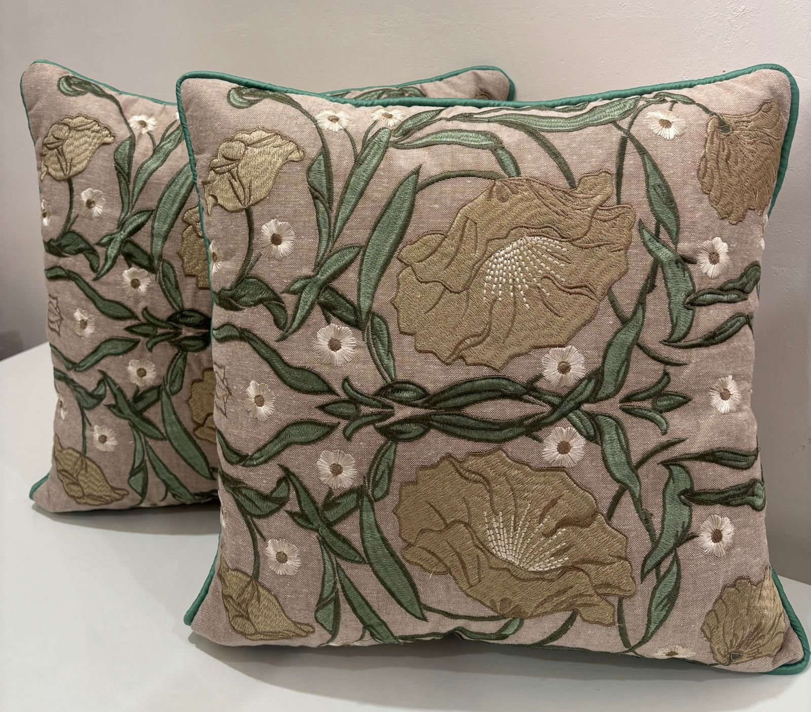 Inspired by a quiet meadow in bloom, this cushion cover features flowing green vines and softly textured floral embroidery on a muted earthy base. The design feels organic and free-flowing, with delicate white accents adding lightness and balance.