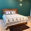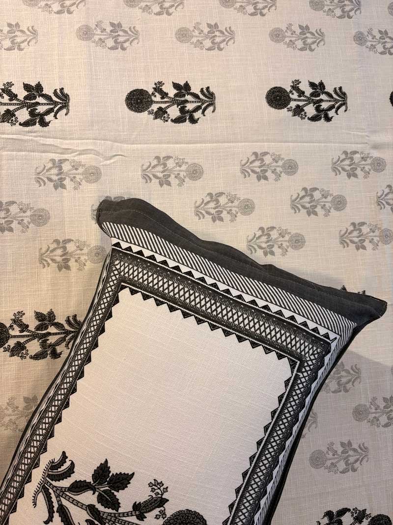 Elevate your space with this Minimalist Black Floral Anokhi print bedsheet, crafted from soft, breathable pure cotton duck fabric. A timeless and elegant choice for any king-size bedroom setup.