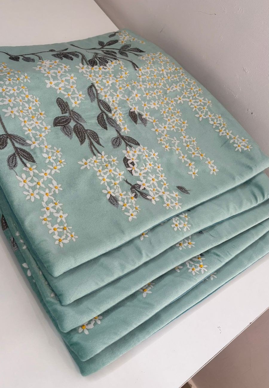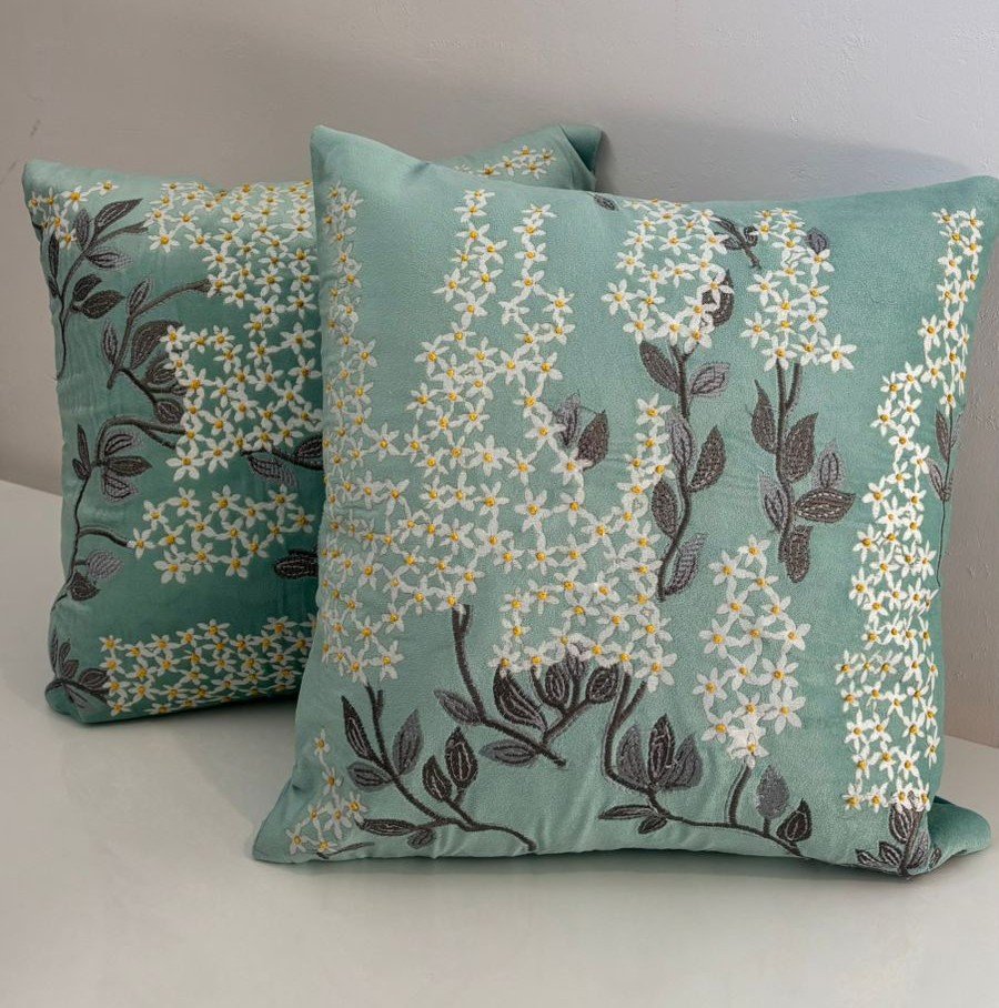 Bring a fresh, calming charm to your living space with this beautifully crafted cushion cover. Set on a soothing mint green base, delicate white blossoms with subtle yellow highlights are intricately embroidered, creating a light and elegant floral flow. The soft cotton-blend fabric feels comfortable to touch while offering durability for everyday use.