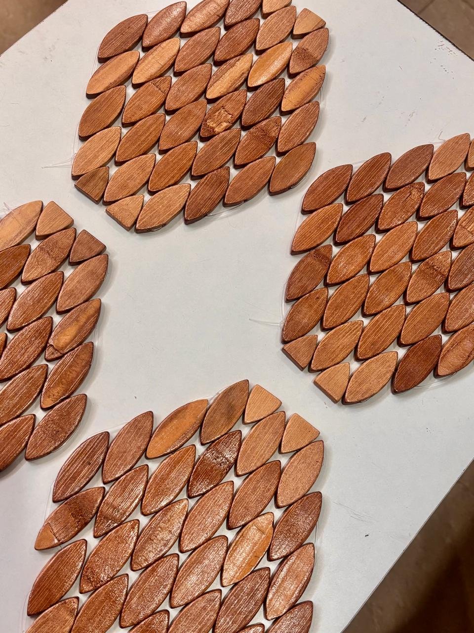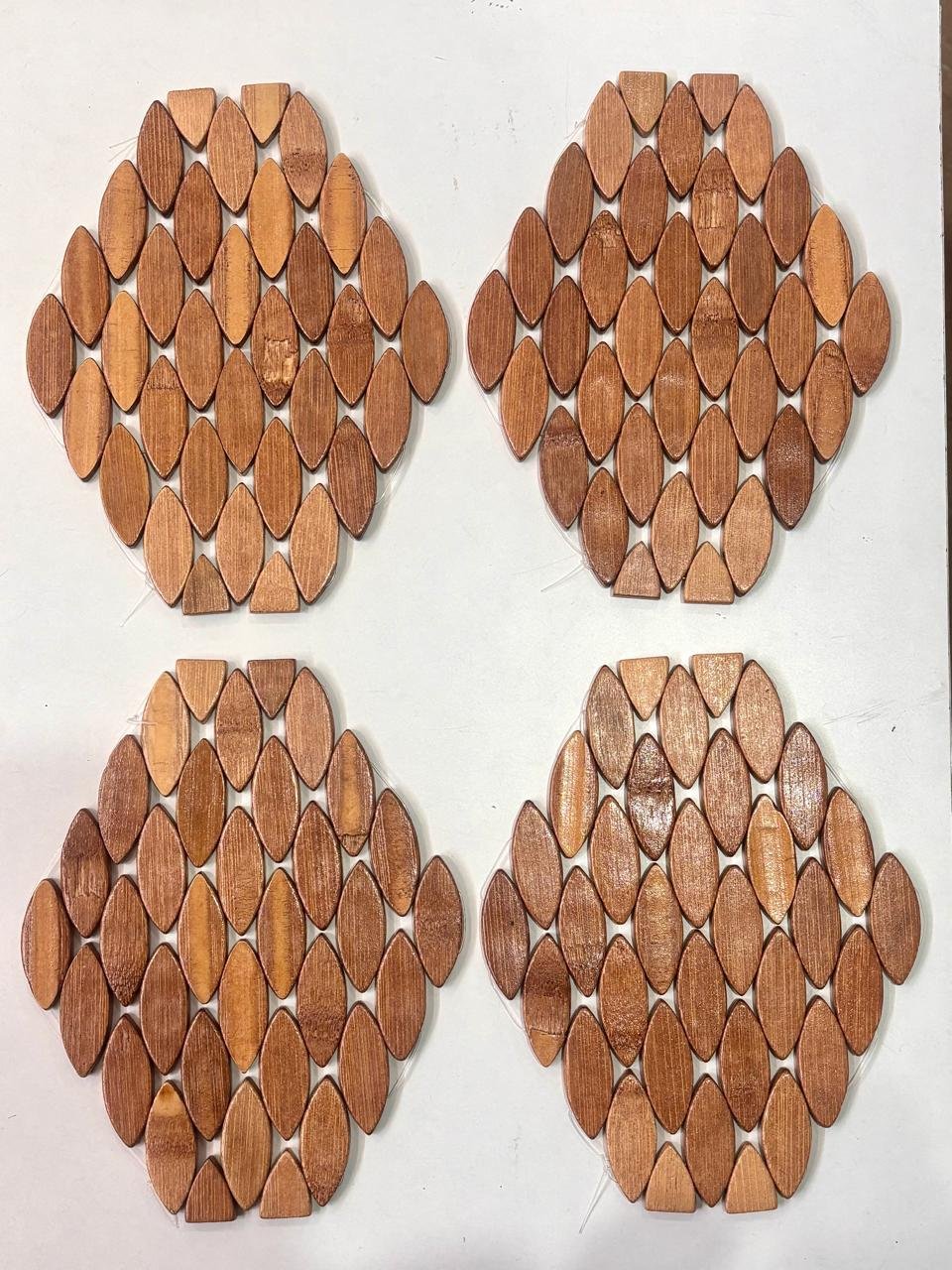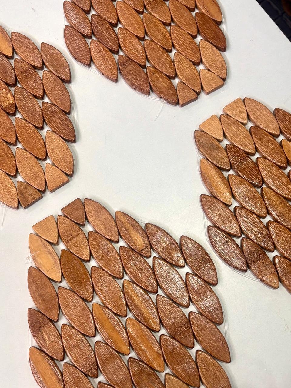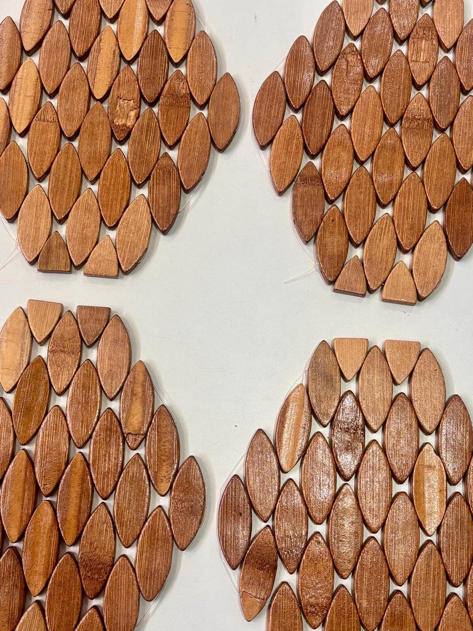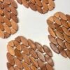 Bring a natural and stylish touch to your dining space with this beautifully crafted oval wooden table mat. Designed with smooth leaf-shaped wooden pieces arranged in a layered pattern, this mat creates a unique textured look that enhances any table setting.