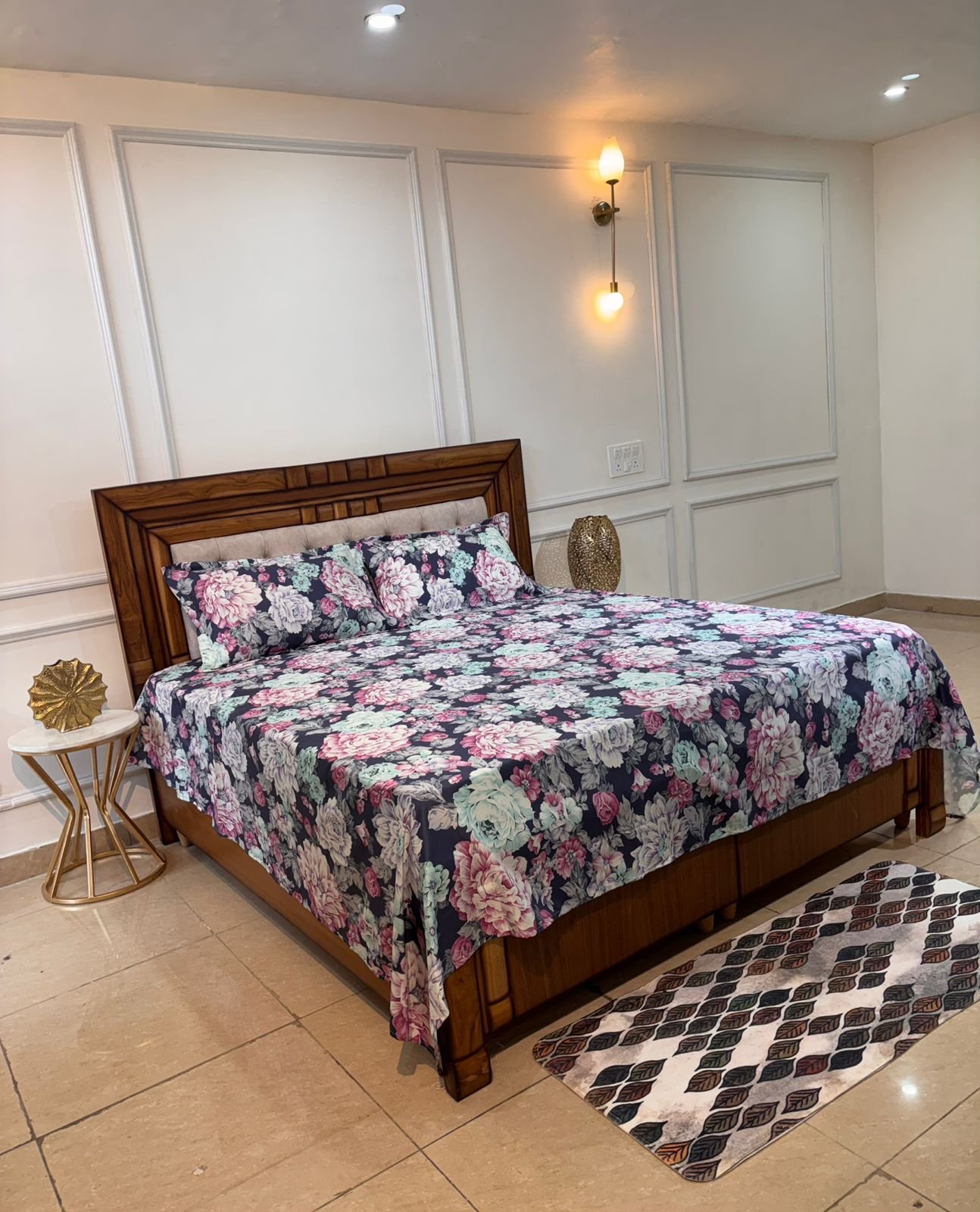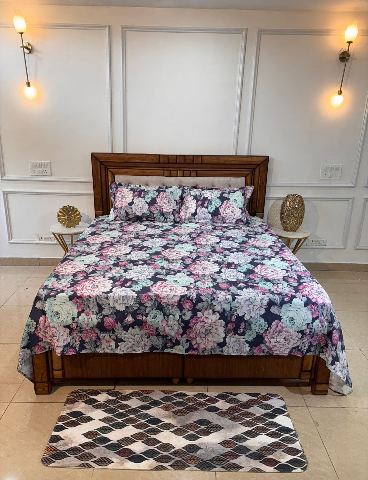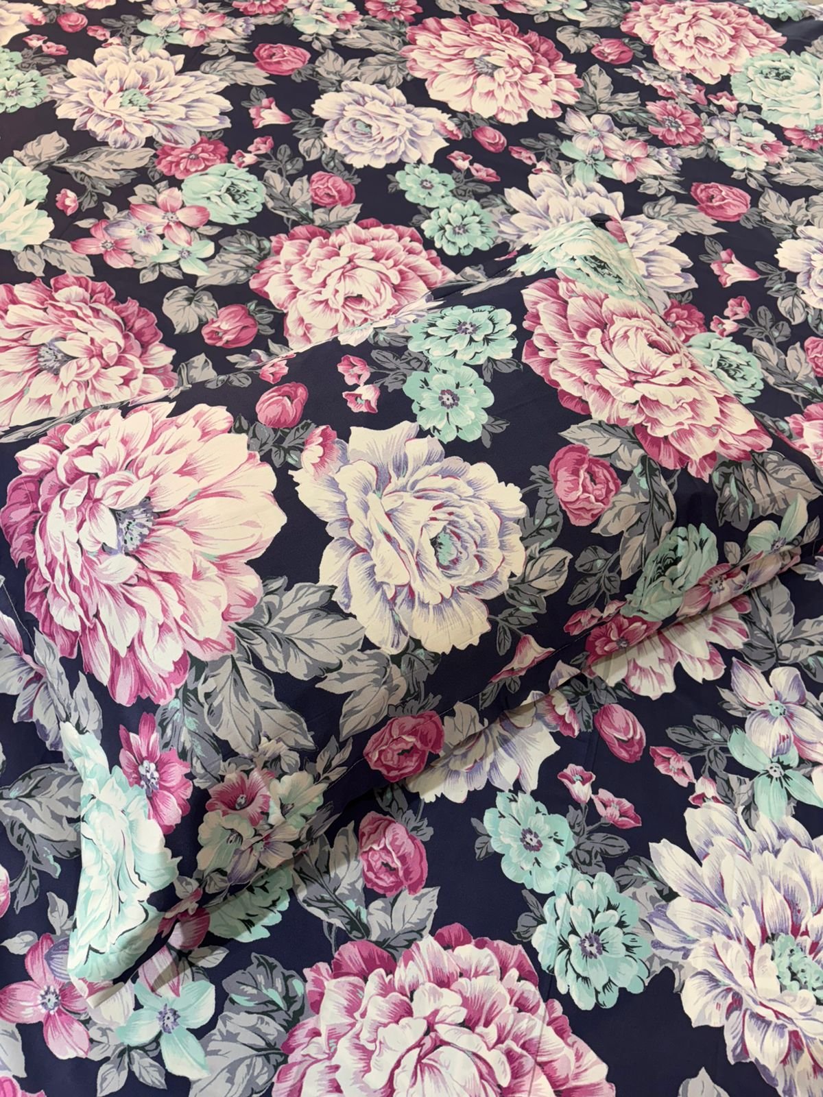 Transform your bedroom into a luxurious floral retreat with this stunning navy blue floral bedsheet set. Featuring an elegant all-over rose pattern in soft pink, blush, mint, and pastel tones, this design creates a rich, romantic look that stands out beautifully against the deep blue base.