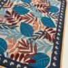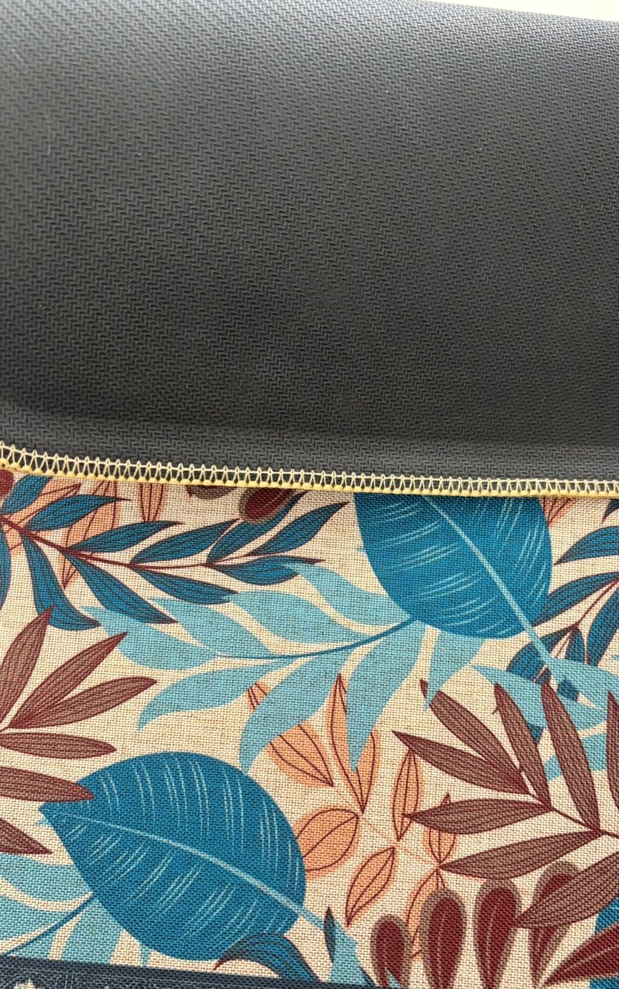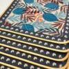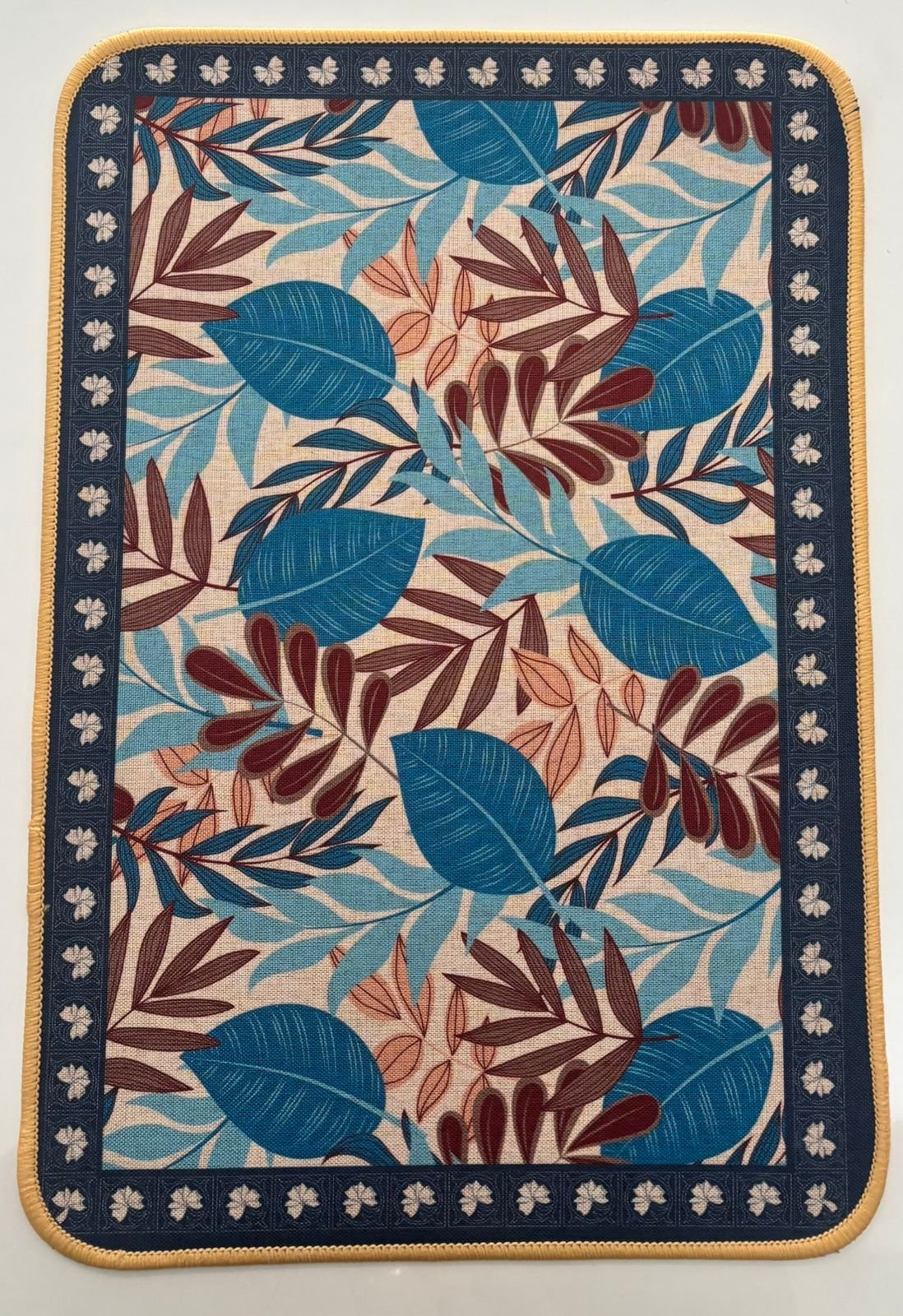 This elegant table mat features an intricate arrangement of tropical foliage in rich hues of blue, maroon, and pastel peach. Surrounded by a navy floral border and finished with reinforced yellow edging, it combines beauty with durability. Ideal for dining tables, coffee tables, or countertops, it brings a touch of natural sophistication to your space.