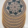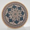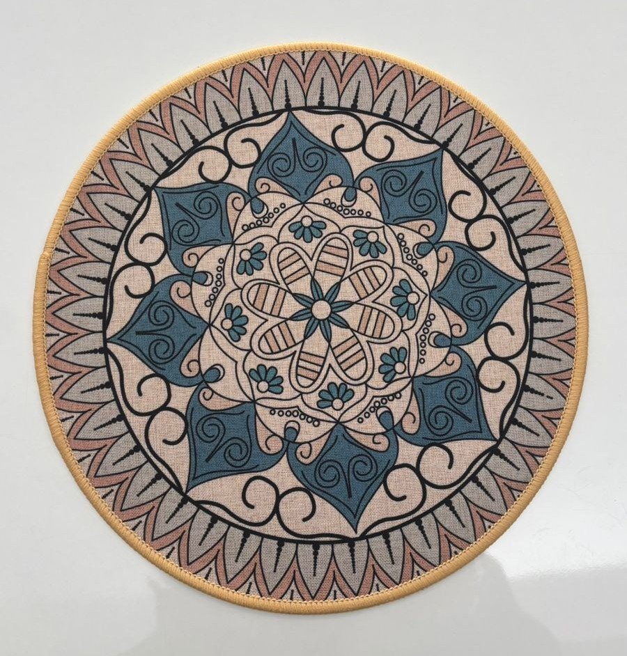 This premium round fabric mat showcases an elegant mandala pattern inspired by traditional artistic motifs. The harmonious blend of beige, teal, and muted blue tones creates a calm and sophisticated look that enhances any interior setting, whether used as a table mat, decorative fabric accent, or meditation mat.