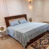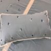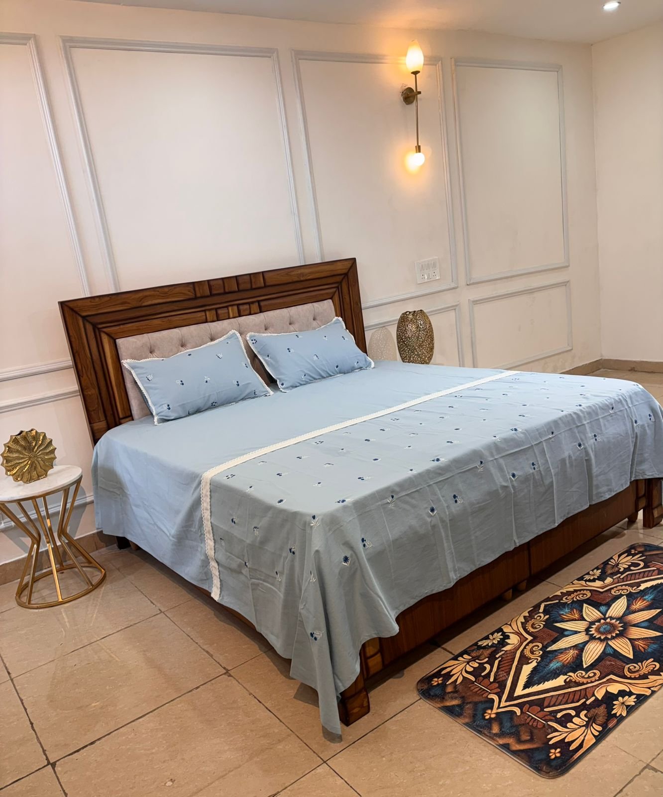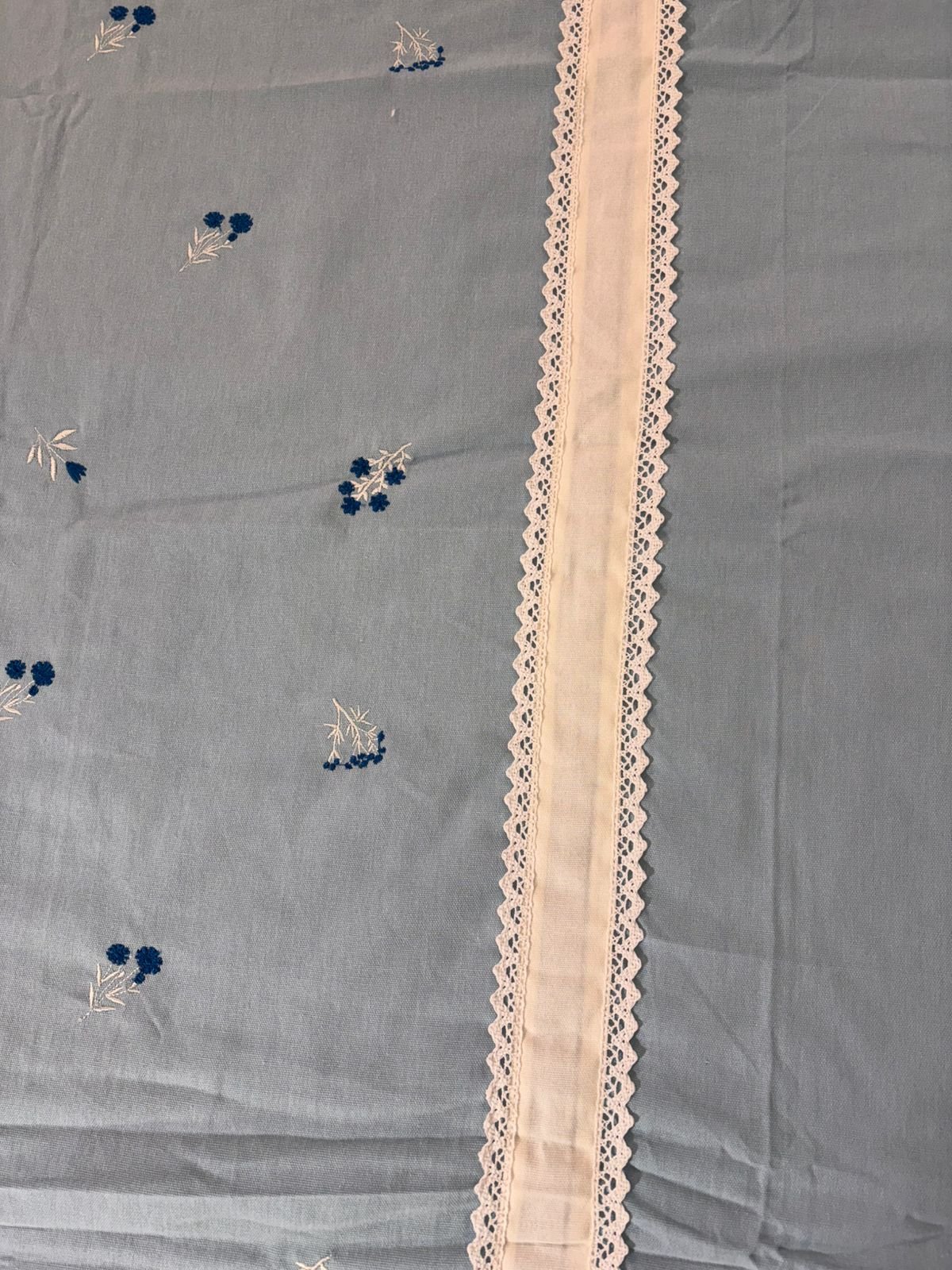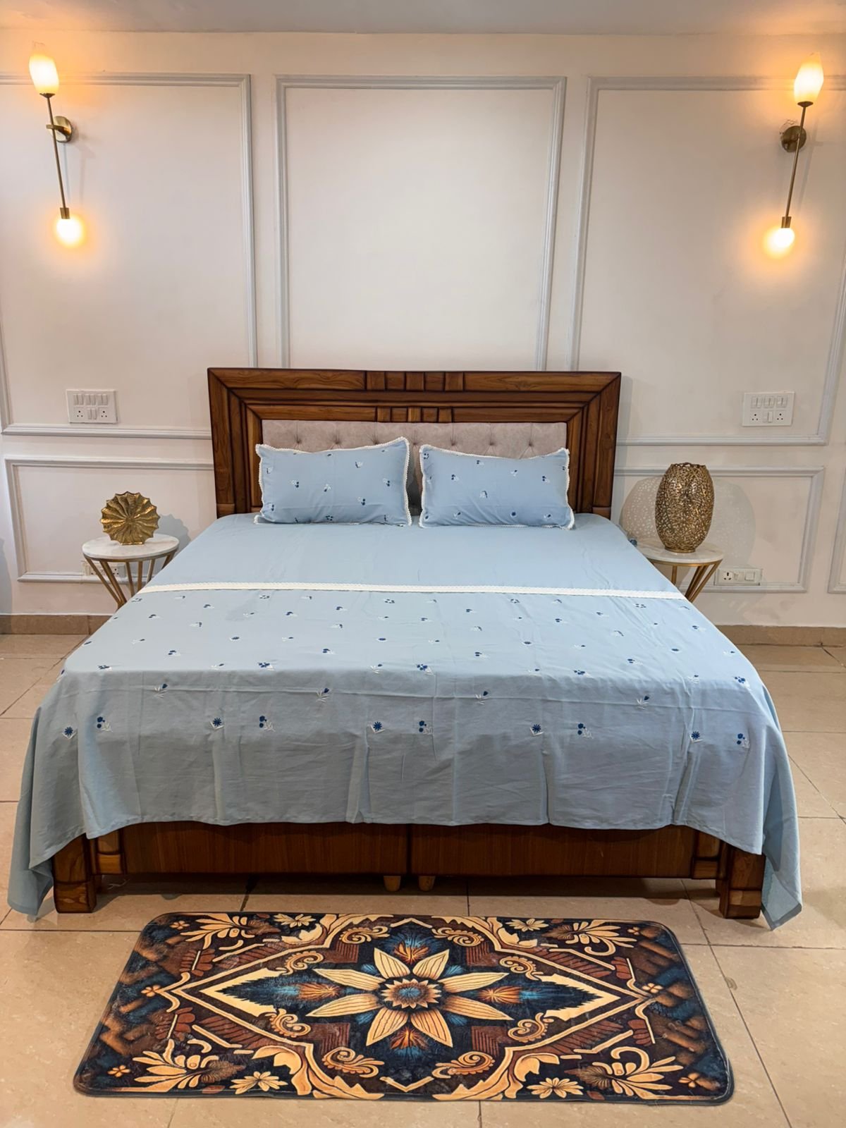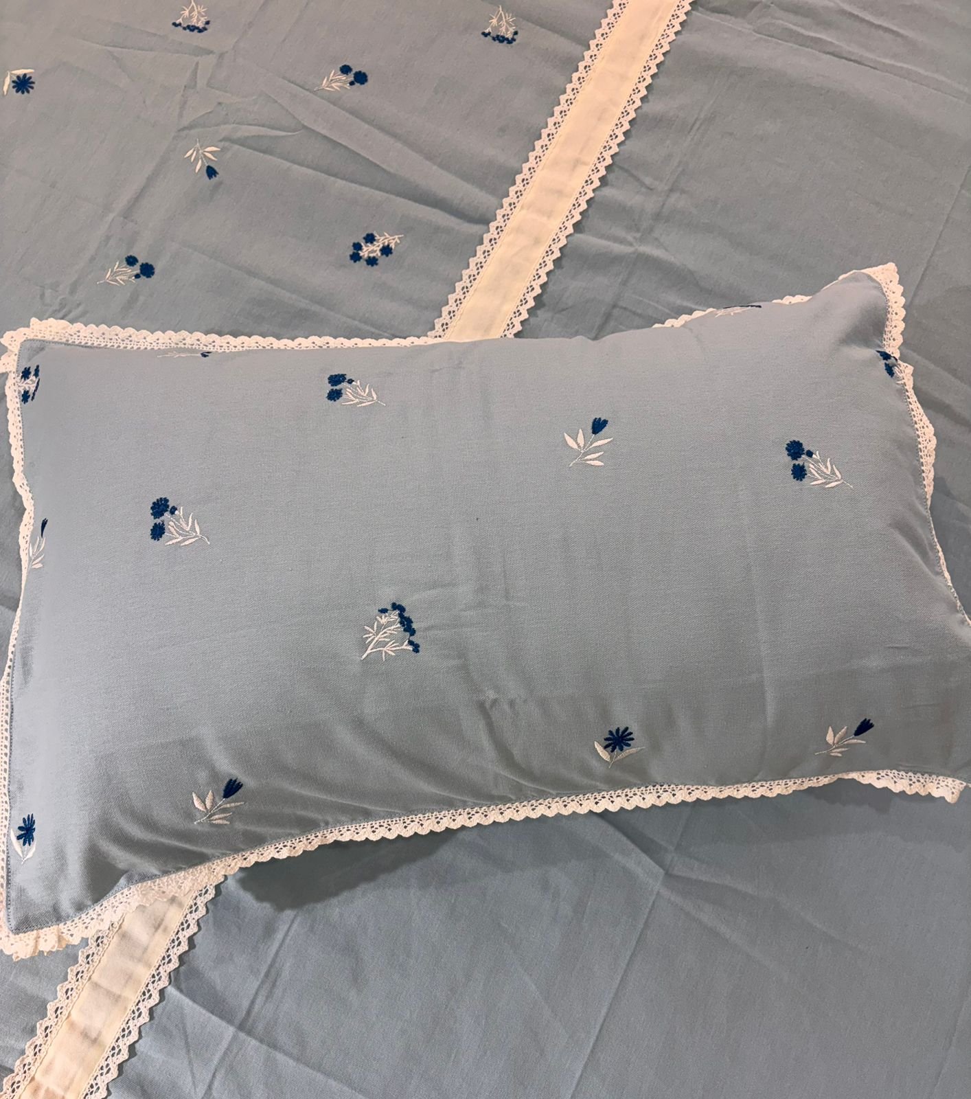 Elevate your bedroom with the understated luxury of our Cloud Whisper Embroidered Bedsheet. Unlike printed patterns, this set features meticulous, small-scale floral embroidery scattered across a solid powder blue canvas. The design is defined by its clean lines and a beautifully detailed white lace border that runs horizontally across the sheet and frames the pillowcases, adding a vintage-inspired touch to a modern silhouette.
