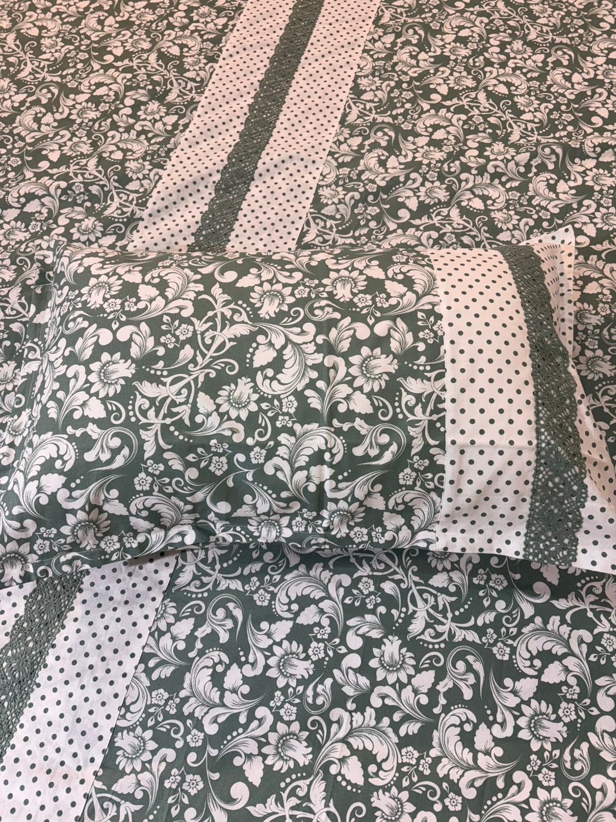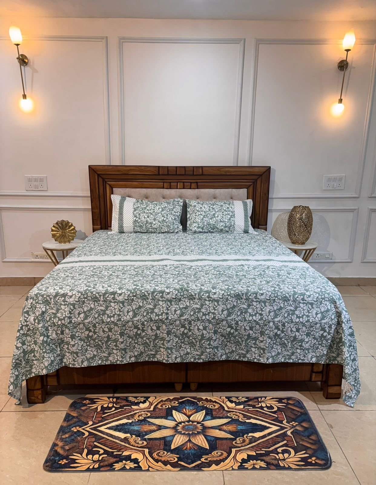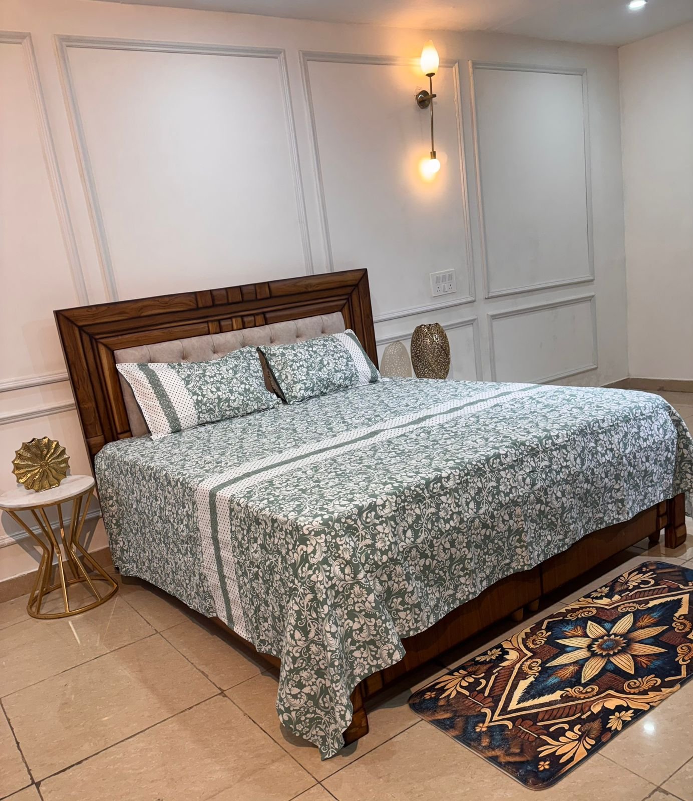 Enhance your bedroom décor with this elegant green and white floral bedsheet set, designed to bring a calm and refreshing feel to your space. The detailed all-over floral print blends beautifully with the soft green base, creating a balanced look that suits both modern and classic interiors.