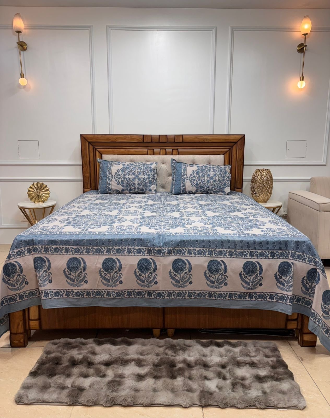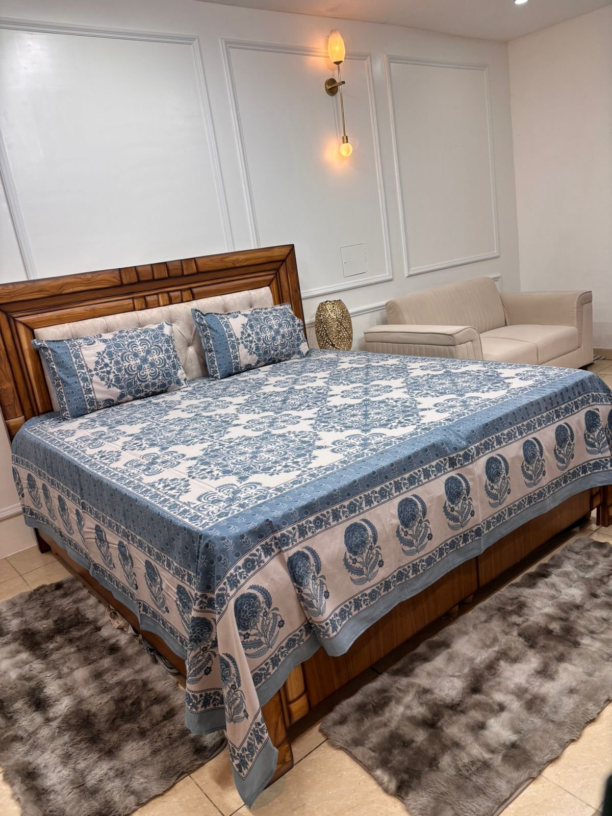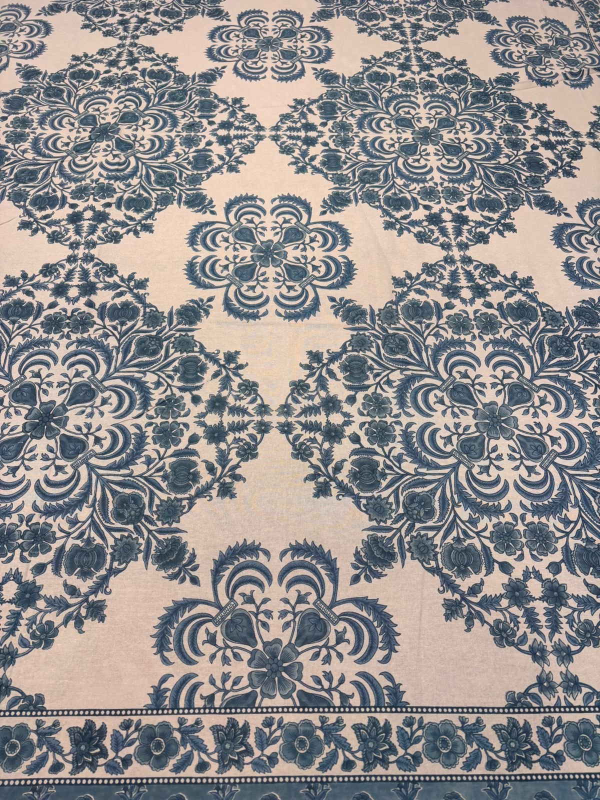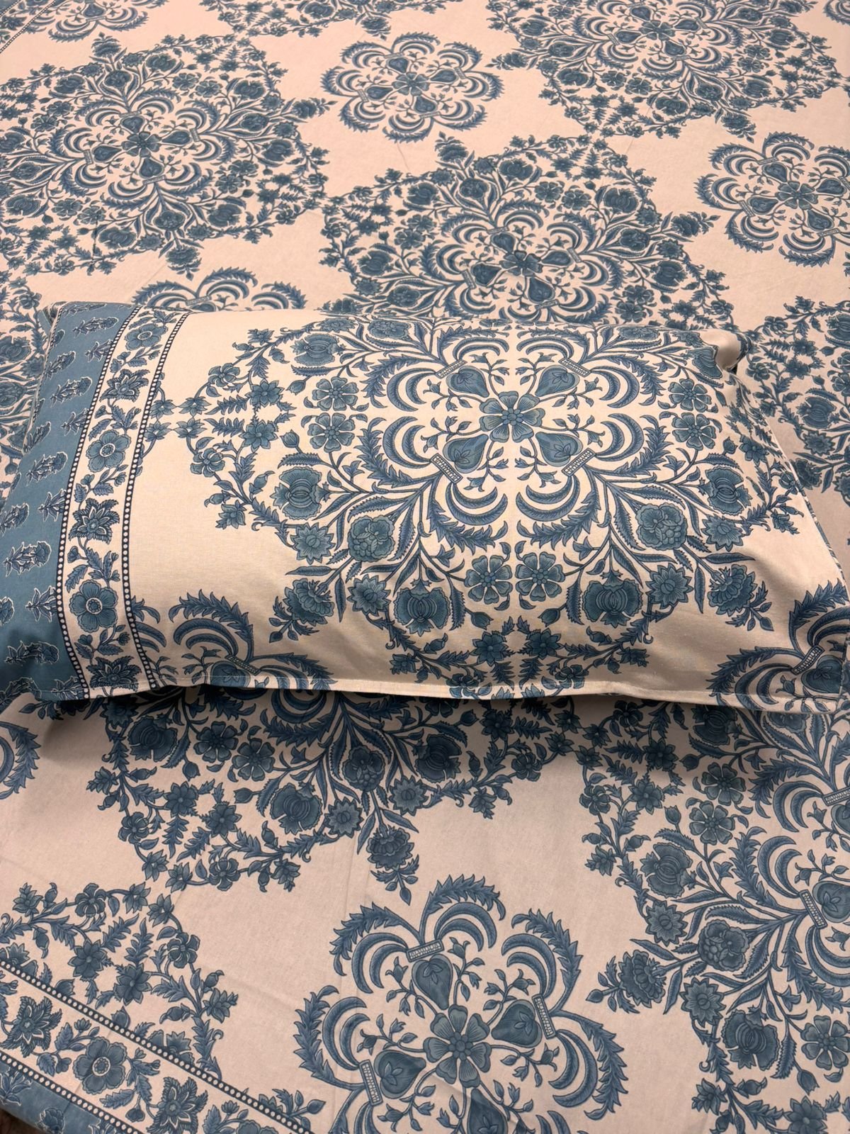 Experience the perfect blend of traditional artistry and modern comfort. This premium bedsheet features a classic Mughal floral border paired with intricate mandala-inspired center motifs. Crafted from high-quality, breathable cotton, it’s designed to provide a soft touch and a regal look to any bedroom.