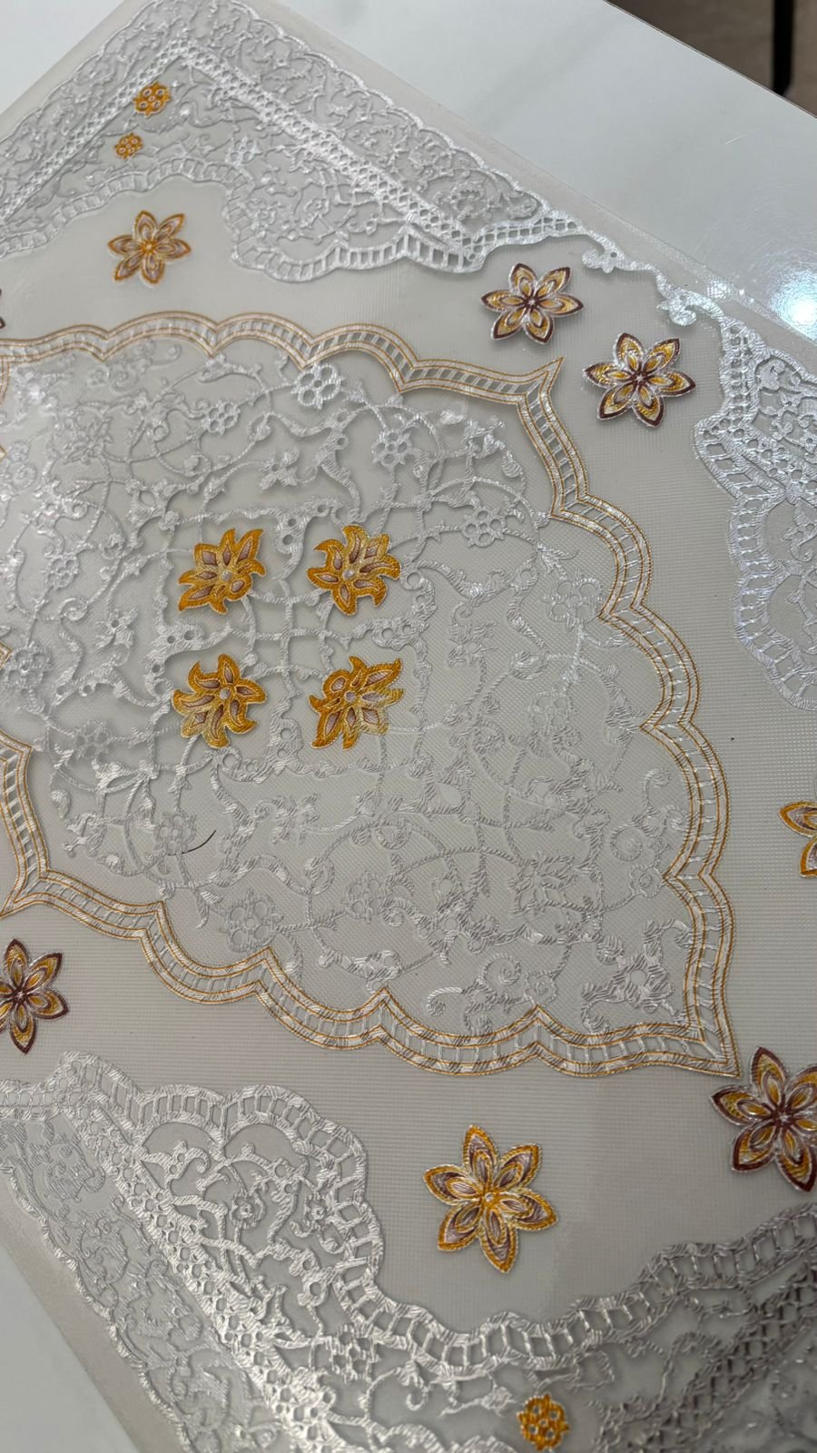 Transform your table into a statement piece with this exquisitely crafted embossed table mat, designed to reflect timeless elegance. Featuring a regal central medallion surrounded by finely detailed lace-inspired patterns and shimmering golden floral highlights, this mat adds depth and luxury to any setting. Made from high-grade PVC, this table mat is completely non-cotton, offering superior durability, water resistance, and effortless maintenance. Its smooth yet textured finish protects your tabletop while delivering a refined decorative appeal that lasts.