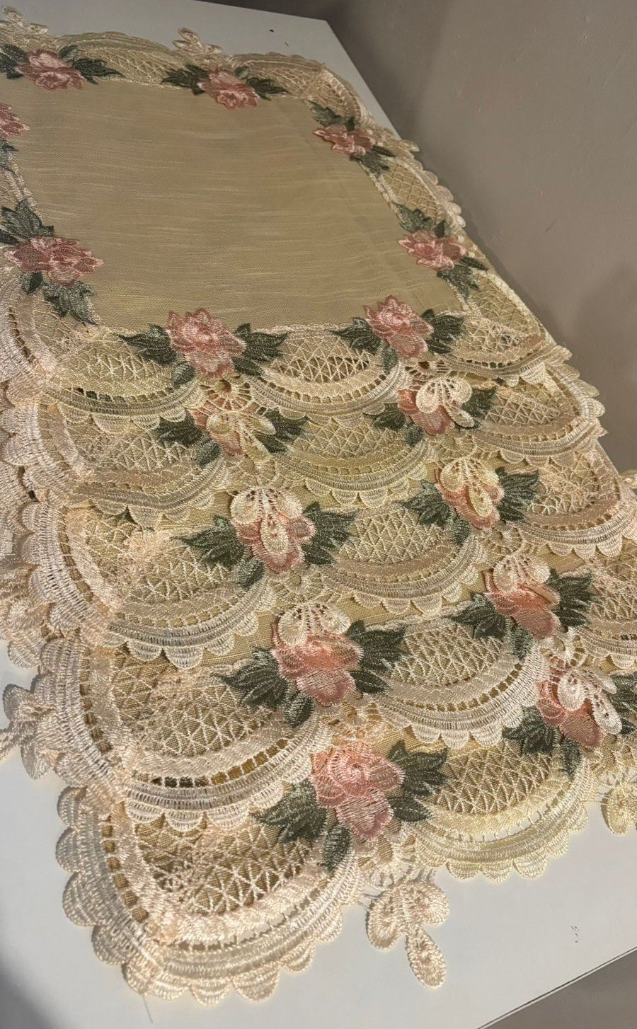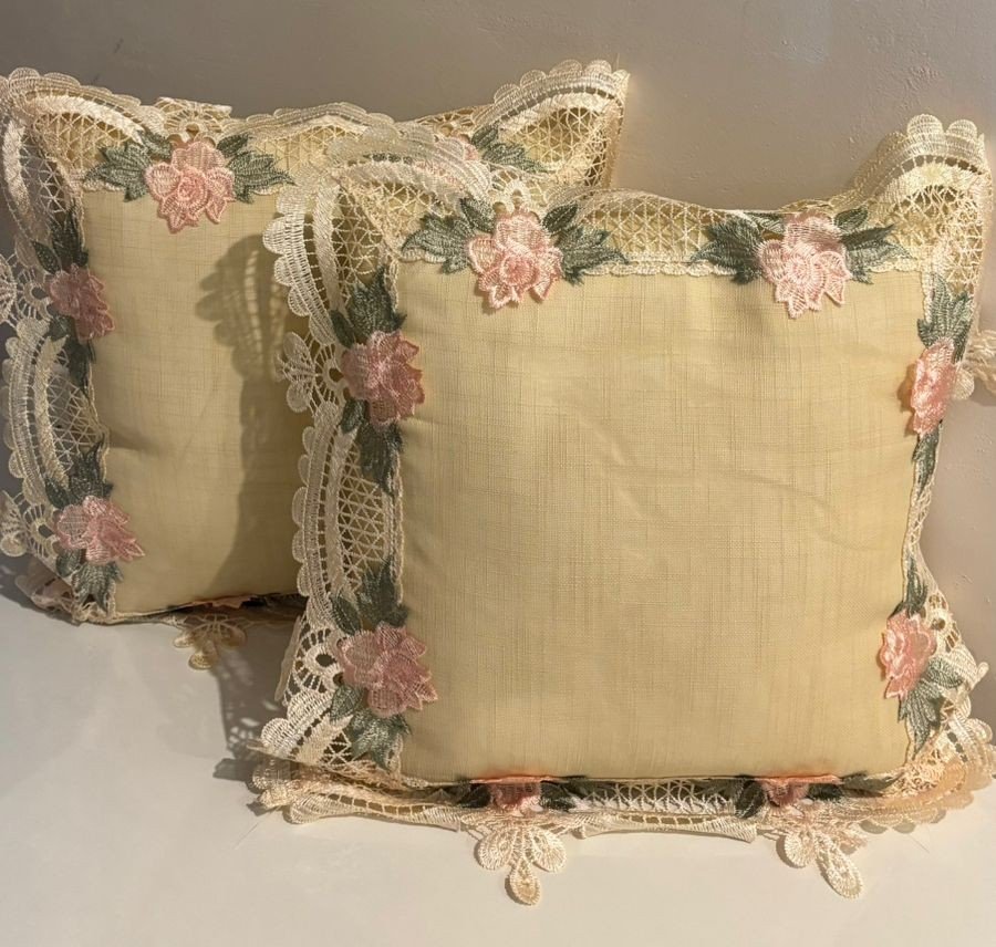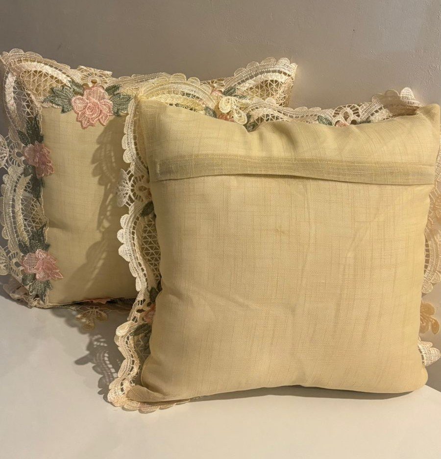 This cushion cover features a graceful cream-toned base framed with exquisite lace detailing and delicate floral embroidery. Soft blush pink flowers and leafy green motifs adorn the borders, creating a romantic and vintage-inspired look. The scalloped lace edges add an elegant, handcrafted charm, making this cushion perfect for classic, shabby-chic, or luxury décor settings. Ideal for sofas, armchairs, or bedroom accents, it brings softness and refinement to any space.