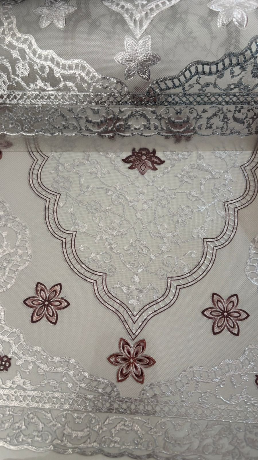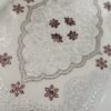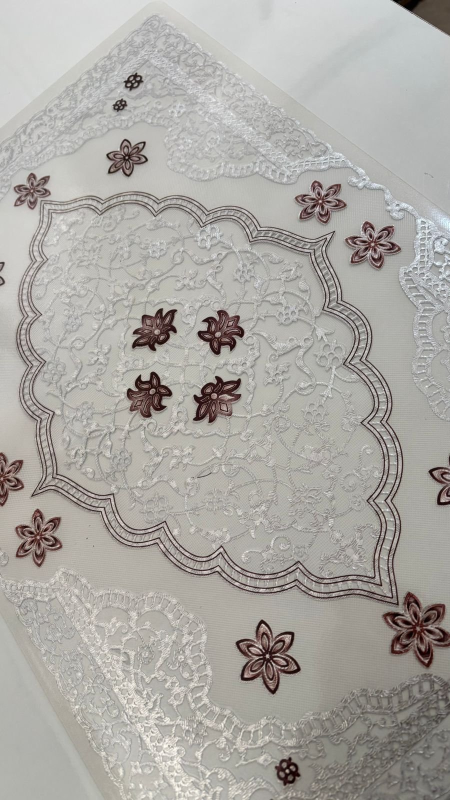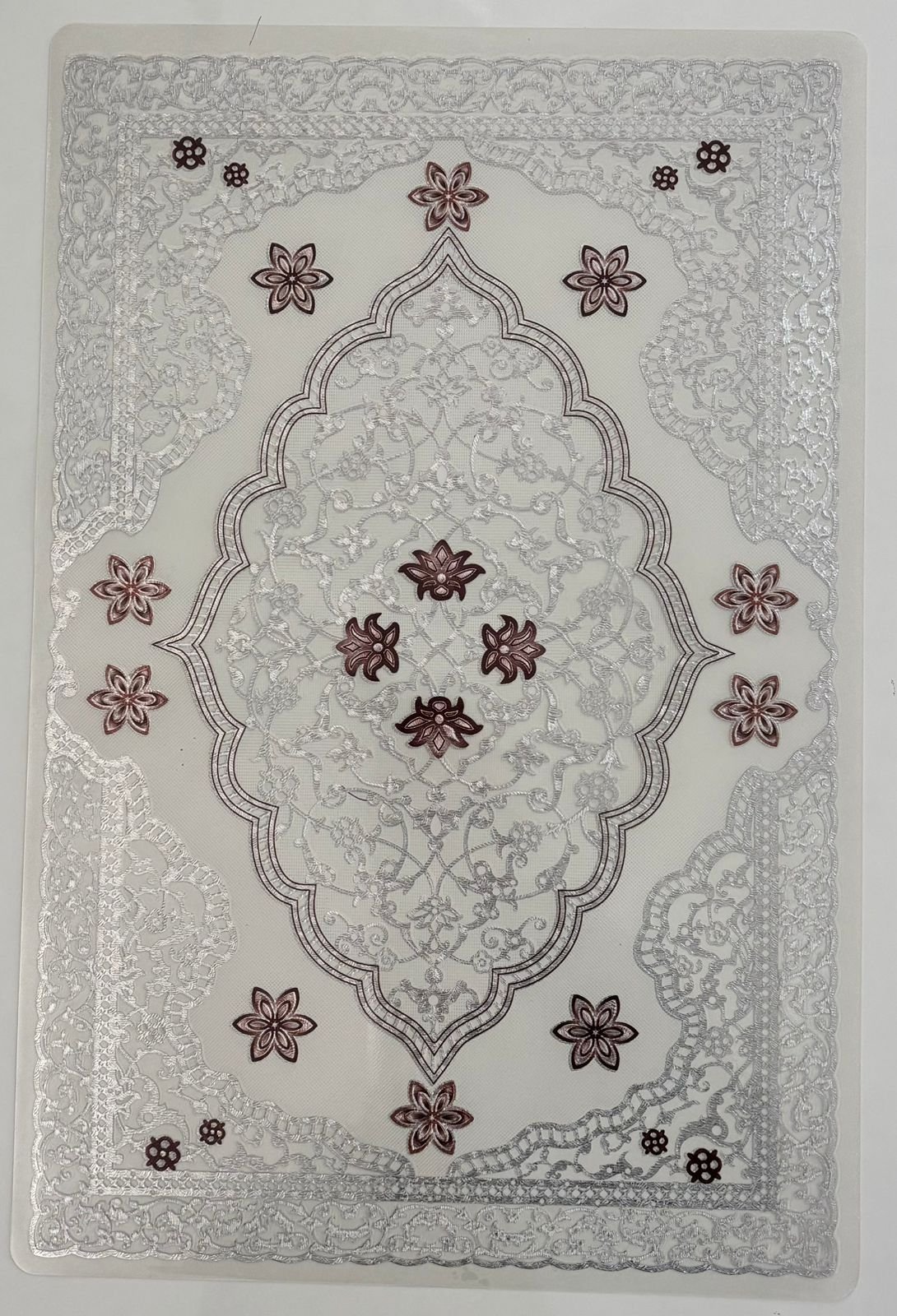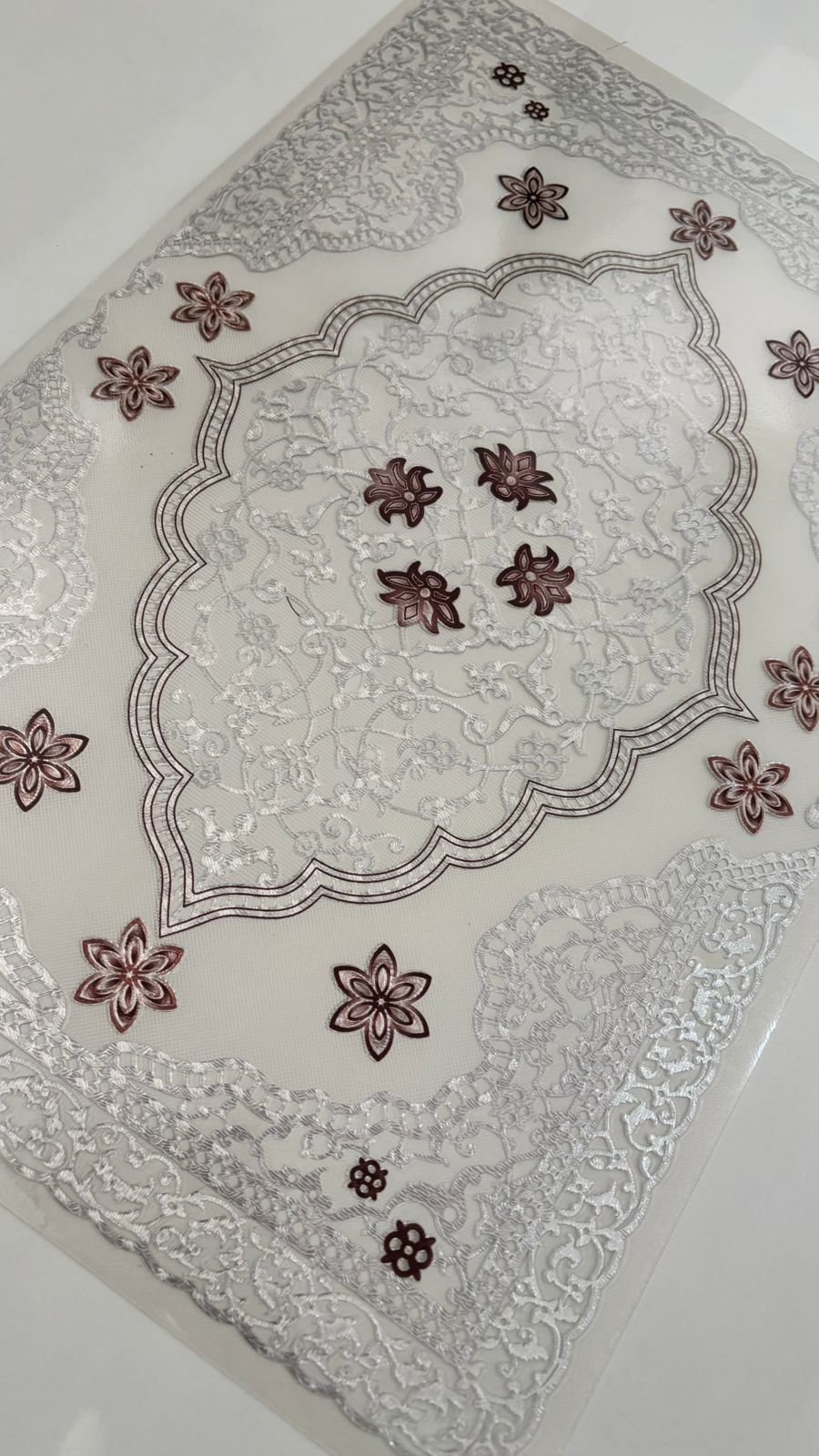 Designed to impress at first glance, this table mat showcases an exquisite lace-effect pattern with refined floral geometry that radiates elegance. The detailed embossed surface creates a soft three-dimensional look, while the harmonious silver base with deep brown accents adds richness without overpowering the table setting. Crafted from high-grade PVC (non-cotton), this mat combines ornamental beauty with everyday practicality, making it a perfect blend of décor and durability.