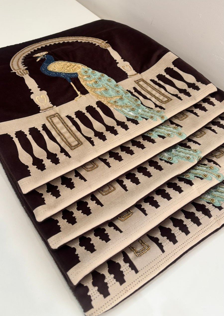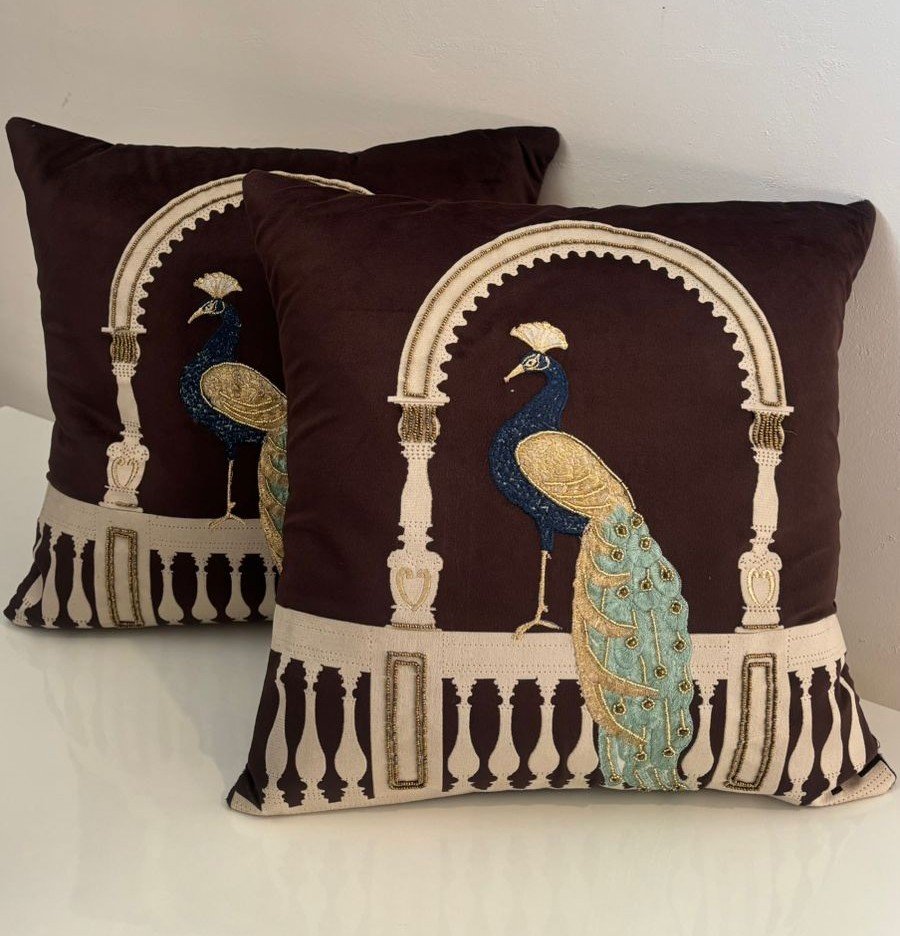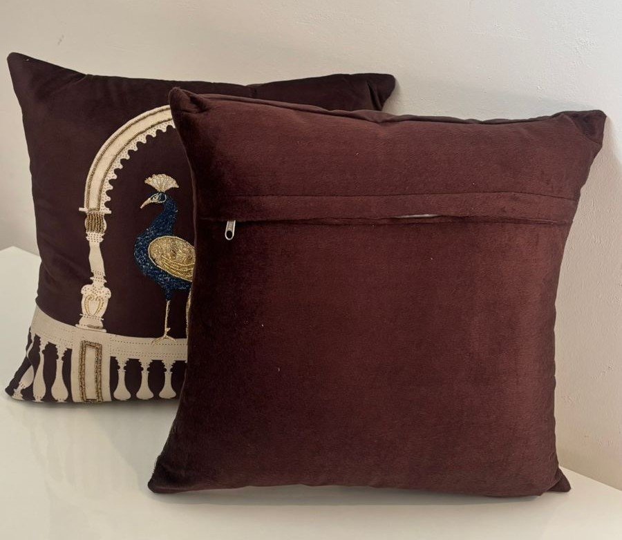 Add a regal statement to your décor with this beautifully crafted cushion cover featuring an elegant peacock under an ornate arch. The rich coffee-brown base is highlighted with ivory detailing and delicate blue-gold embroidery, creating a luxurious, palace-inspired look.