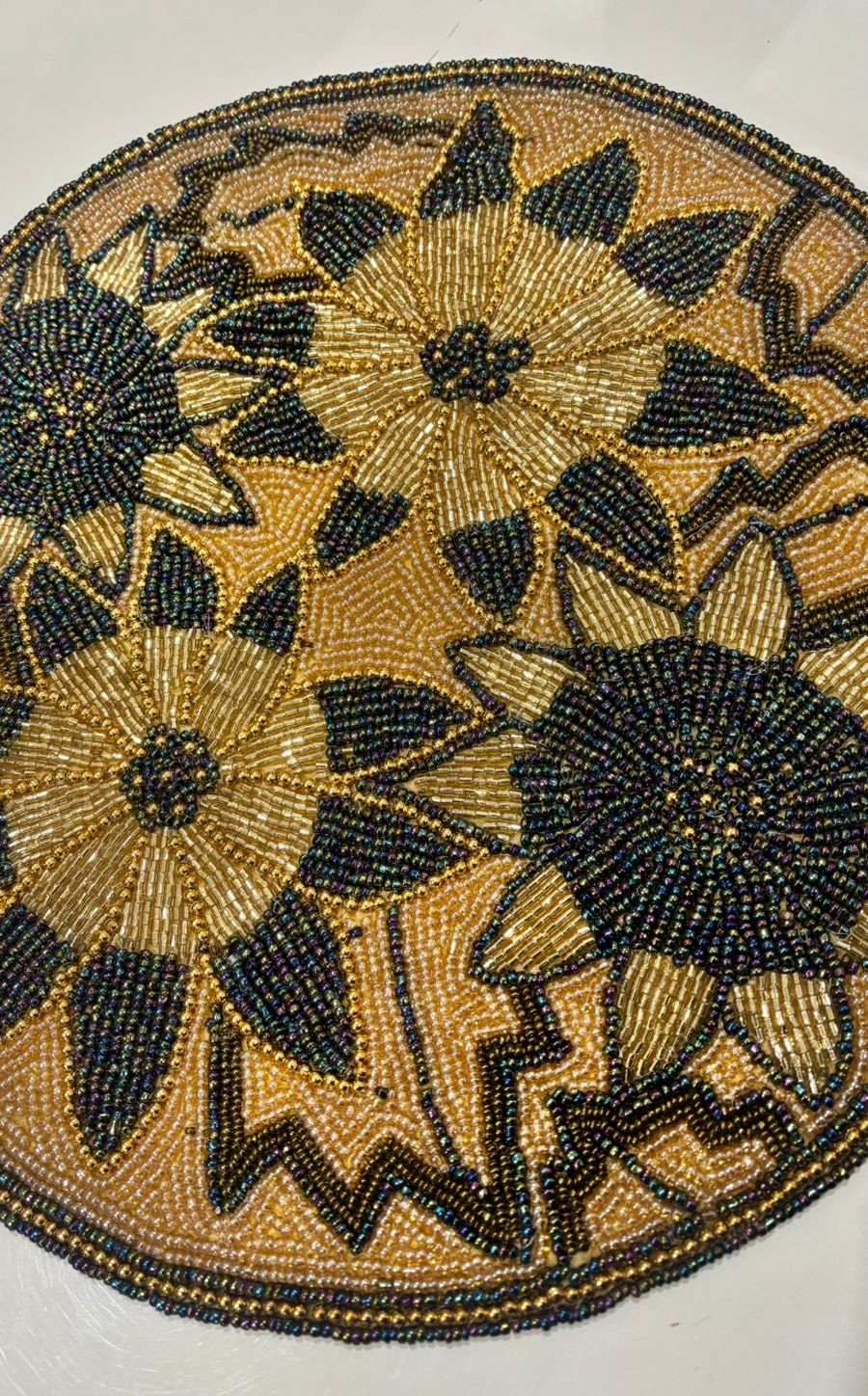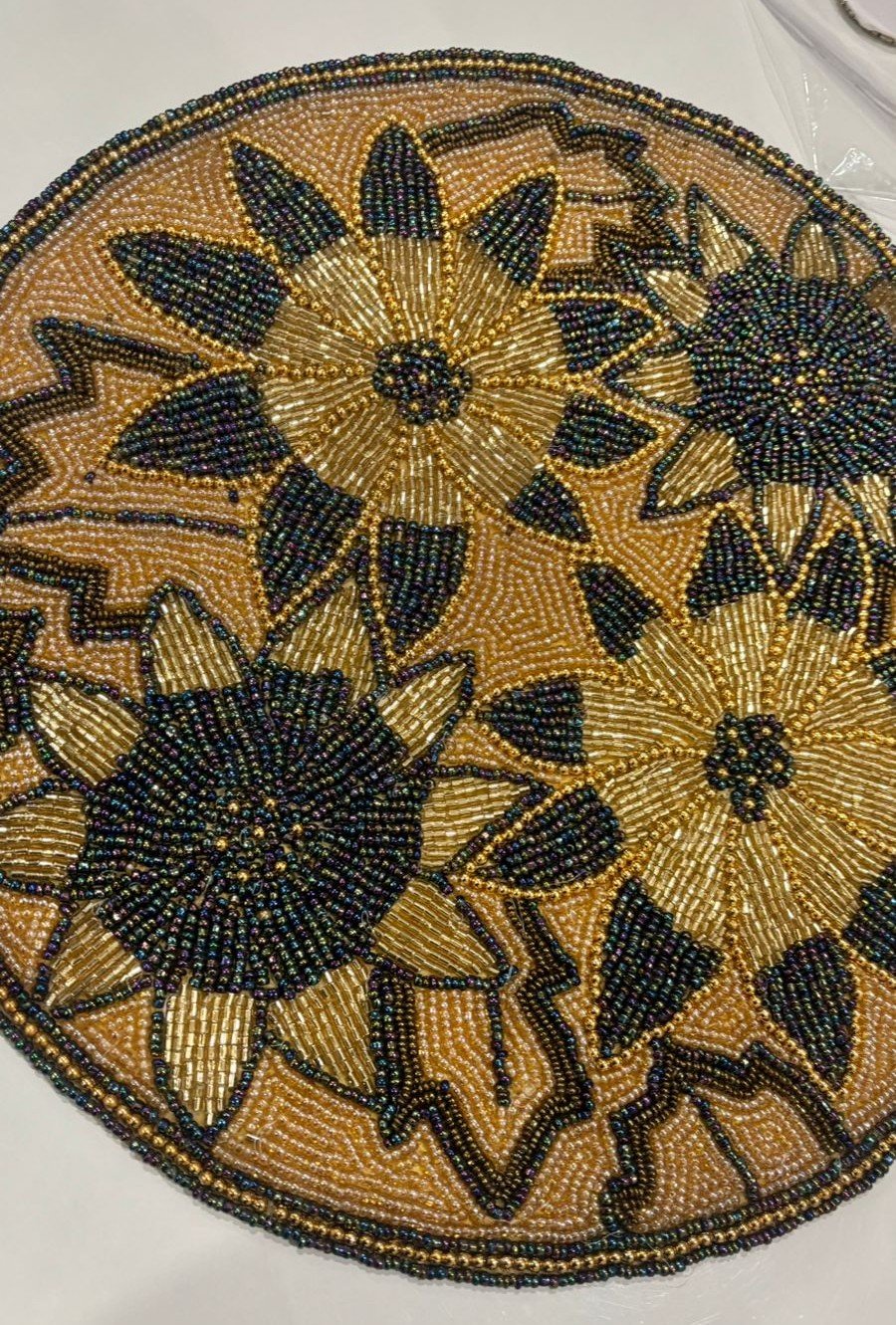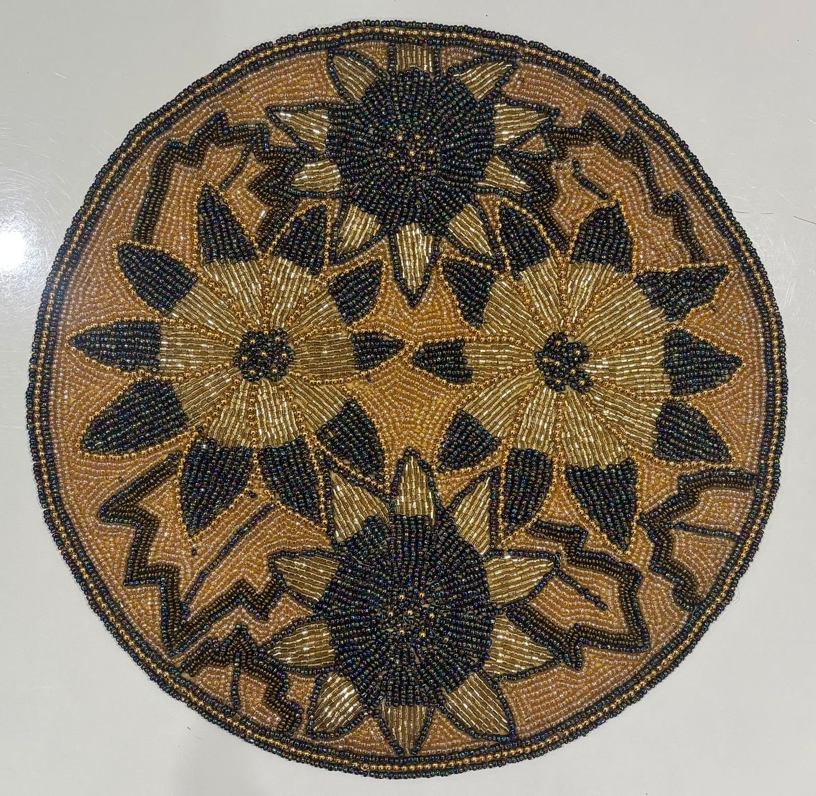 Bring timeless elegance to your dining space with this exquisitely handcrafted table mat, inspired by radiant sunflower motifs. Intricately hand-beaded with shimmering gold, deep black, and antique bronze tones, this round mat showcases exceptional artisan detailing and rich texture. The layered floral design creates a striking centerpiece that elevates everyday dining as well as festive table settings.