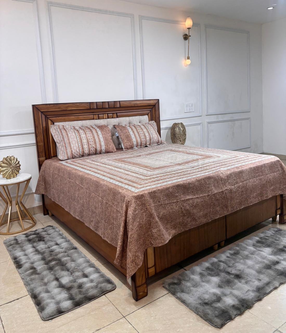 Add a touch of classical symmetry and earthy warmth to your bedroom with our Sienna Heritage Bedsheet Set. This design features a masterfully structured concentric border layout that draws the eye toward the center, creating a sense of balanced luxury for your sleep sanctuary.