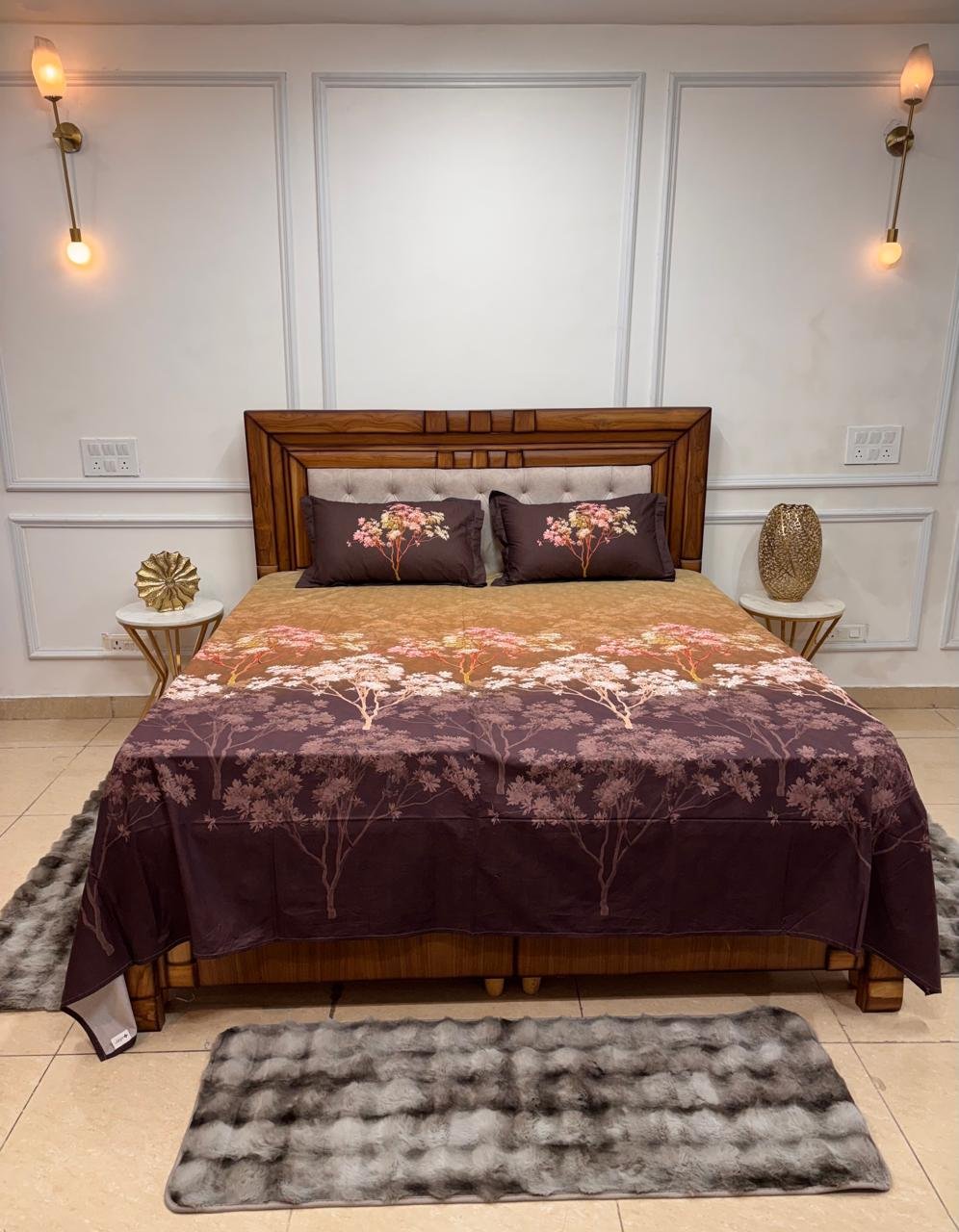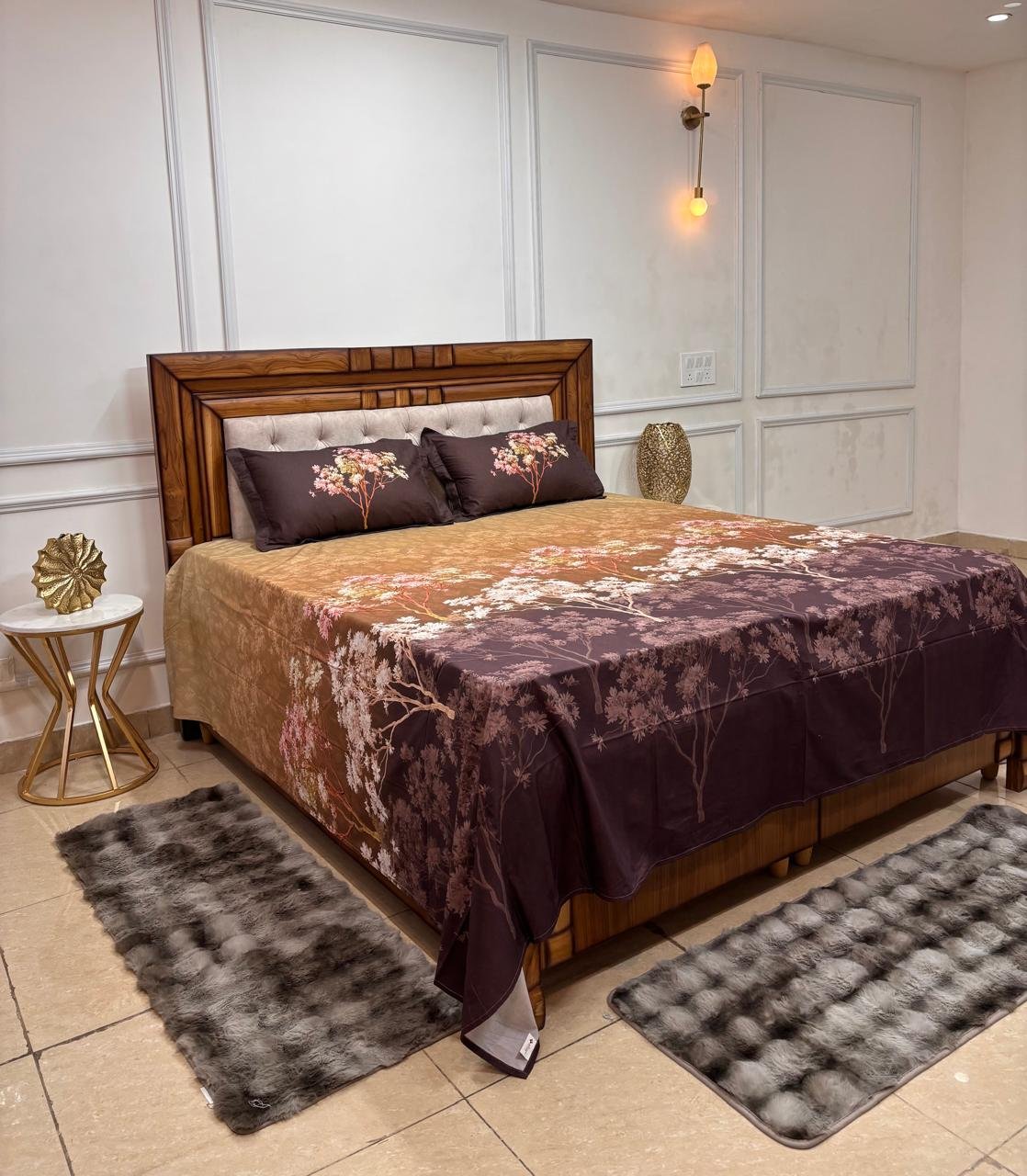 Infuse your bedroom with the warm, rich tones of a sunset with our Twilight Orchard Ombré Bedsheet. This artistic bedding set features a sophisticated color transition that captures the tranquil beauty of an evening garden.