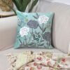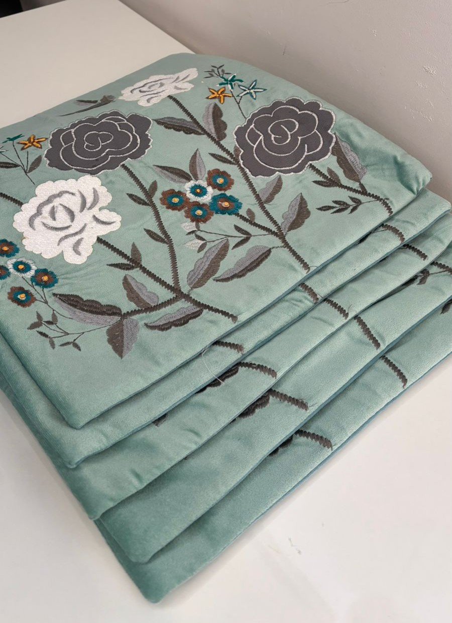 Bring calm elegance to your space with this beautifully embroidered cushion cover. Set on a soothing sage green velvet base, it features detailed floral motifs in white and charcoal grey, highlighted with subtle pops of teal and mustard. The rich velvet fabric adds a soft, luxurious feel, while the intricate embroidery gives it a handcrafted, artistic charm.